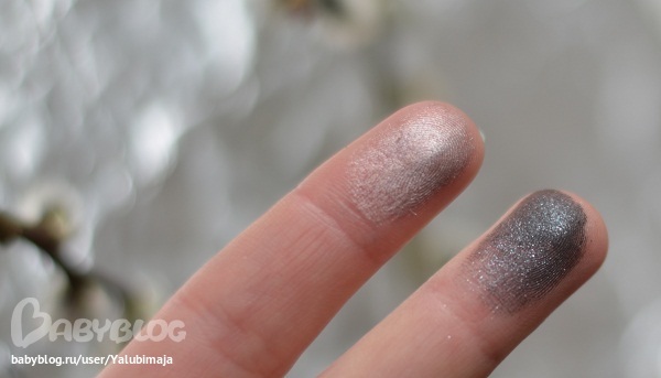 В палетке два сияющих оттенка, жемчужно-розовый и темно-серый. Блесточки очень мелкие, смотрятся совсем не вульгарно. Наносить лучше мокрой кисточкой, т.к. при нанесении сухим способом блестки осыпаются на лицо))