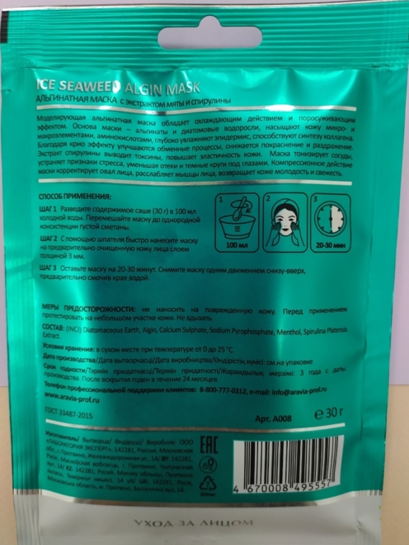 Маска для лицаНашла хорошие альгинатные маски от Российского бренда Aravia. Хотелось такую маску найти, чтоб снимала отёки, покраснения и увлажняла. Наконец довелось мне познакомится с этими эффективными масочками. Заказала через сайт Аравия несколько штук разных. Во-первых привлекло то, что в мини упаковках маски, что для меня удобно, высыпал пакетик и развёл, с утра хочется быстро привести лицо в порядок. Во вторых составы хорошие, работающие, осветляют, хорошо увлажняют и я знаю как они полезны для кожи, я же сама косметолог, просто в декрете. Я делала пока с мятой и спирулиной и она за 20 мин сняла мне отёки и подтянула лицо
