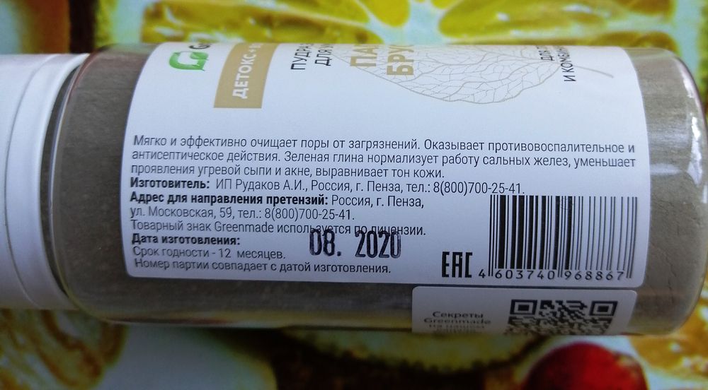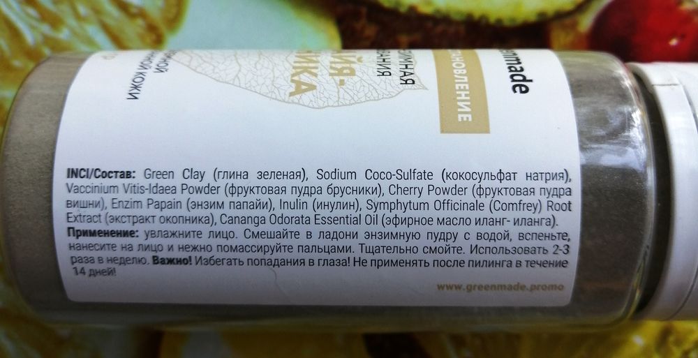 «Глина зеленая, кокосульфат натрия, фруктовая пудра брусники, фруктовая пудра вишни, энзим папайи, инулин, экстракт окопника, эфирное масло иланг- иланга»