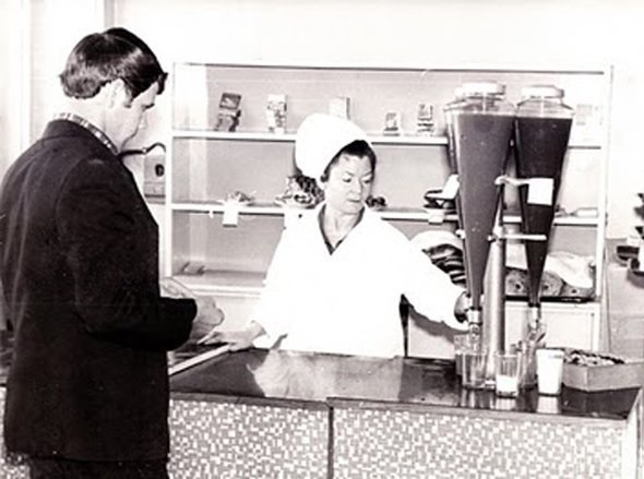 Томатный сок за 10 копеек из таких конусных штуковин с краником, и на витрине - стакан с солью крупной, грязно-розоватой от сока, чайная ложка в стакане. Рядом - яблочный и берёзовый конусы.
