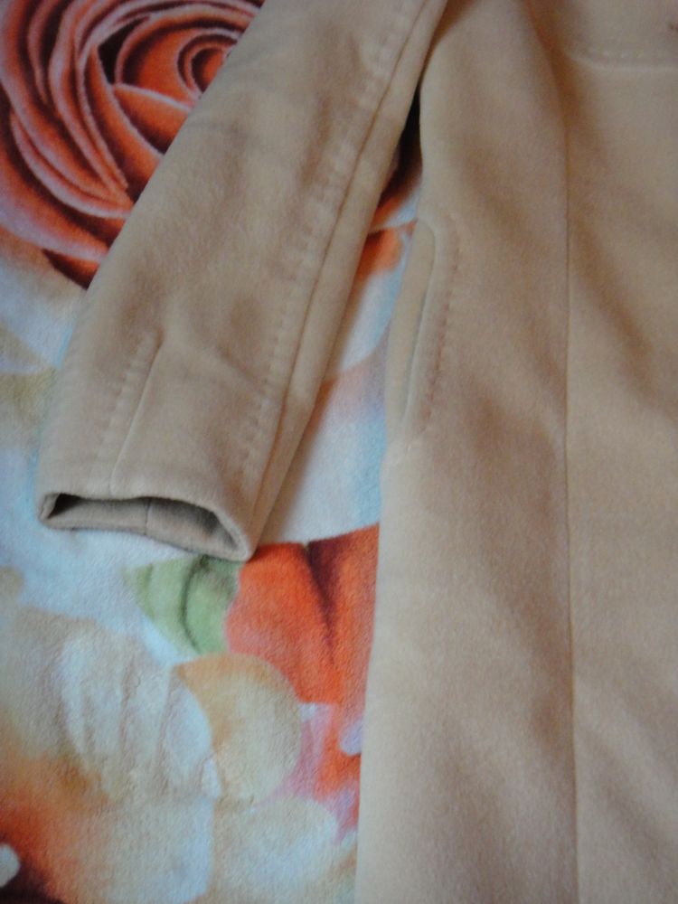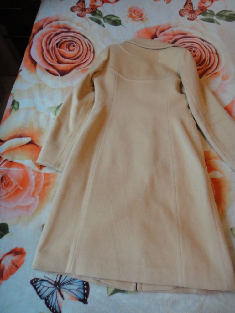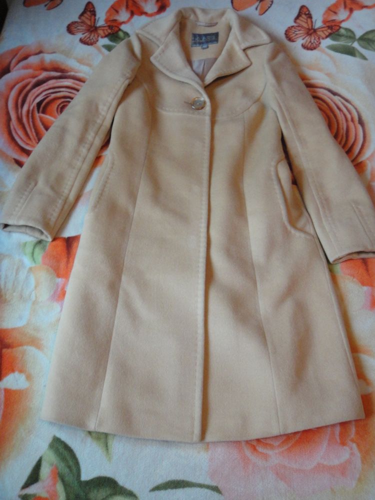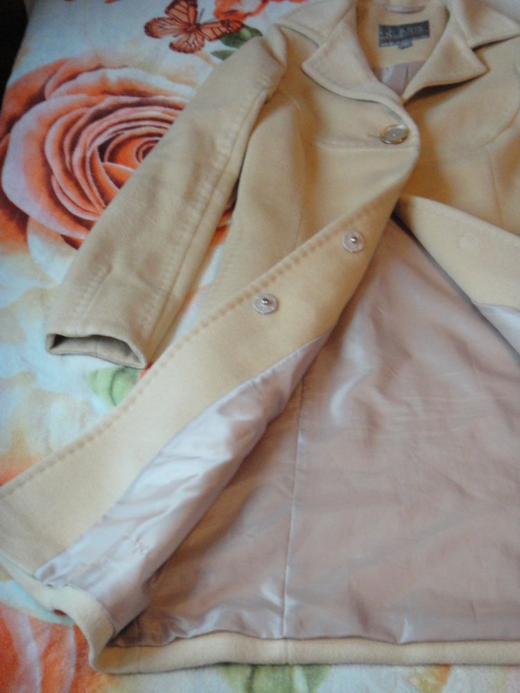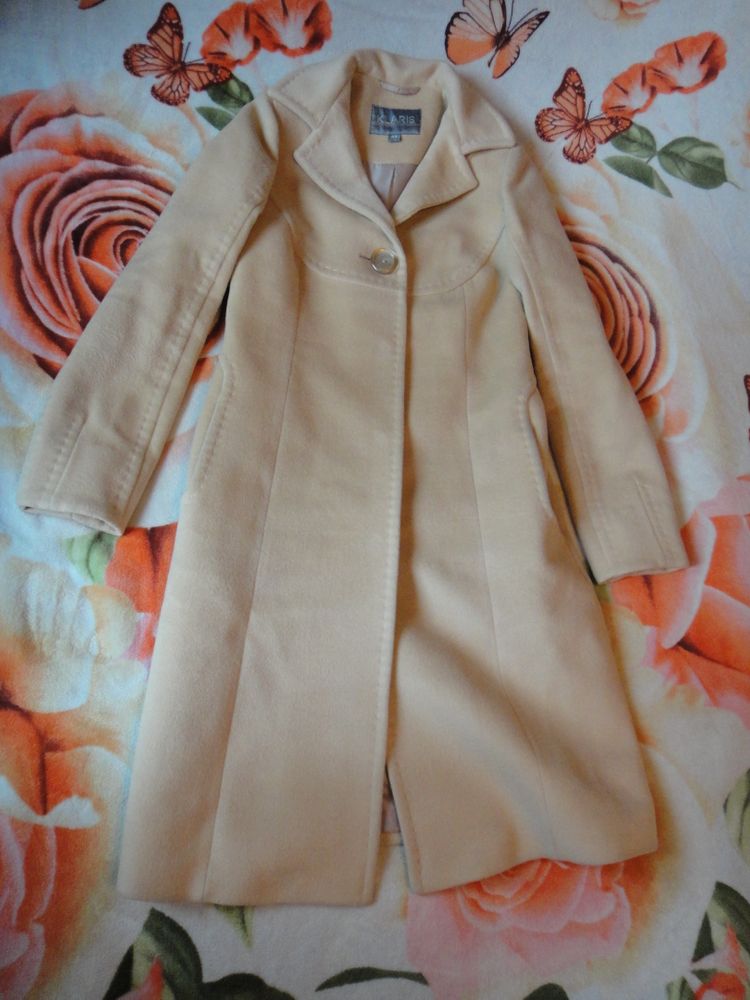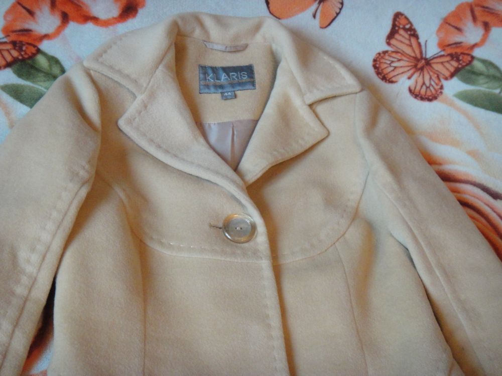 1.Бежевое пальто Klaris, р.44. Застежка - 1 пуговица + кнопки, 2 кармана. Состав: верх - 78% шерсть, 7% вискоза, 15% кашемир, подкладка - 100% полиэстер. Б/у мало. Длина по спинке - 105 см., рукав: от плеча - 65 см., от подмышки - 45 см., ПОГ - 45 см. Экв. 3500 руб.