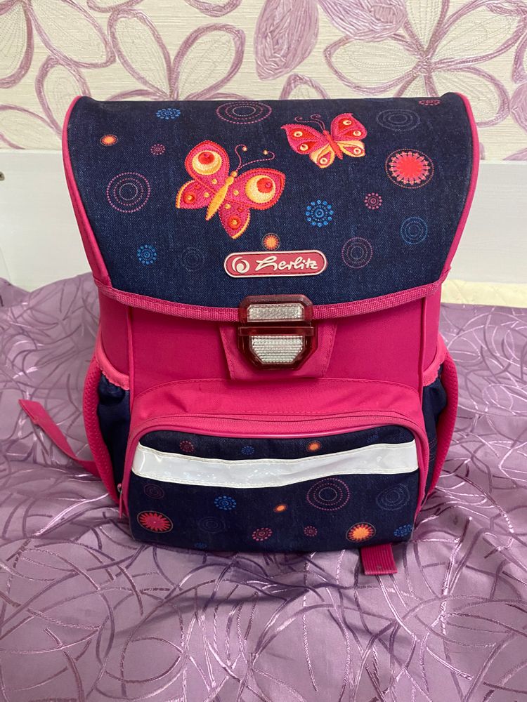 Школьный ранец herlitz, пользовались с удовольствием в 1-3 классе, состояние отличное . Помыт, нет загрязнений и потёртостей. Все молнии работают. Вес 900 г, дышащая спинка, ортопедический, светоотражающие полосы . В комплекте мешок для обуви в декоре рюкзака. Пенал твёрдый поищу, но скорее всего, его нет. Экв 2300