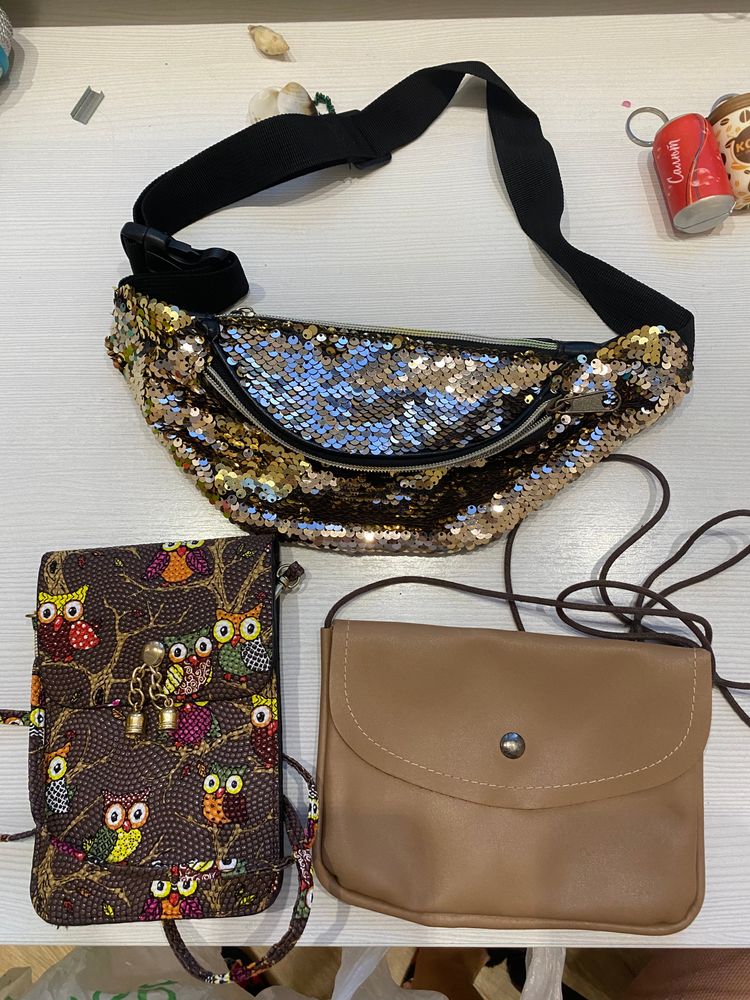 Сумки для девочек подростков: с птичками 300, темно-бежевая (есть регулировка длины ремешка) 500. Поясную сумку бананку забрали.
