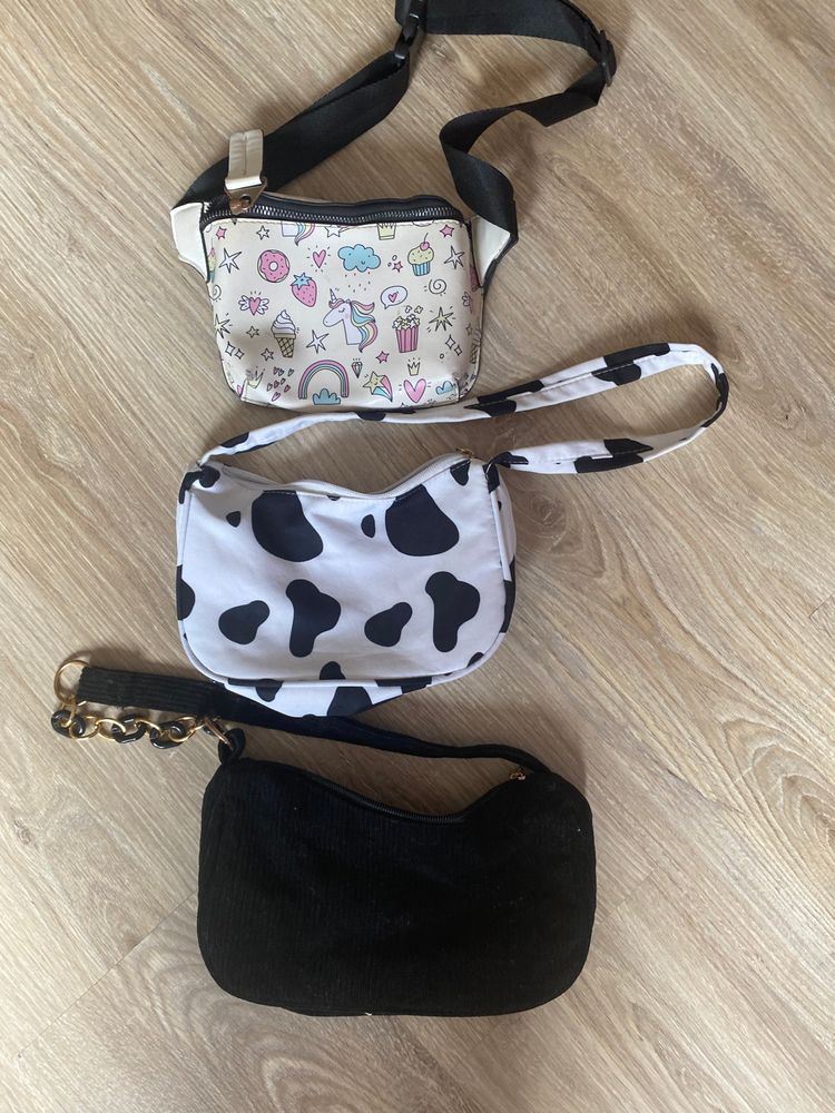 Сумки для девочек-подростков: поясная с единорогами экокожа, с мелкими недочетами 200 - есть небольшие потертости, черно-белая сумка 500, черная сумка вельвет с цепочкой 600