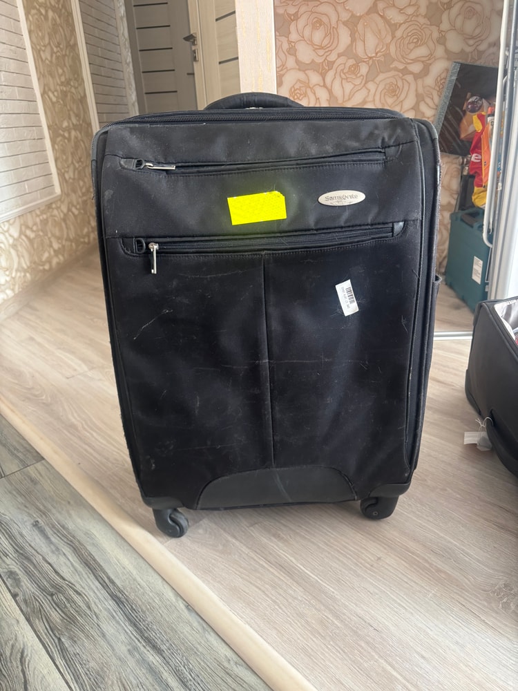 чемодан samsonite бу оригинал. размер М на 23-25 кг, с раздвижением объема - с ним до 32 кг, все рабочее. Недочеты: надо помыть, кое-где на стыках немного потрепалась ткань, вылетели держатели от собачек (поставили колечки для удобства)-сами молнии работают без нареканий. Не ремонтировался, все работает, механизмы вечные и очень удобный. Желтая наклейка снимается без следа. 7000