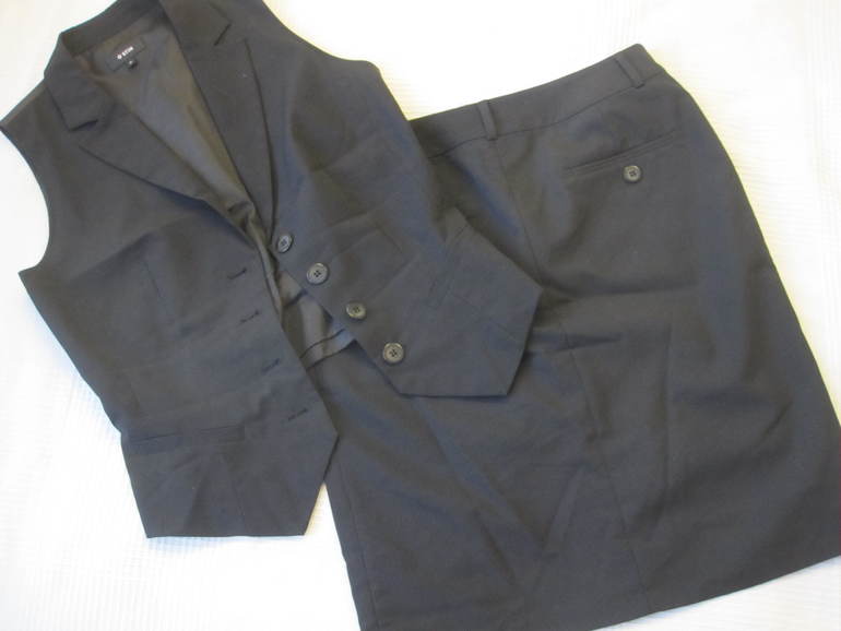 Жилетка и юбка Остин. Черные в белую полоску (на фото не видно-отредактирую). Жилетка садиться отлично по фигуре, юбку не носила совсем (новая, только постирала). Размер М. Экв. 800
