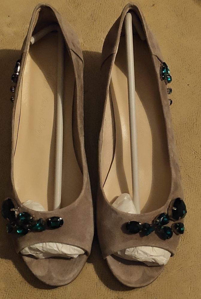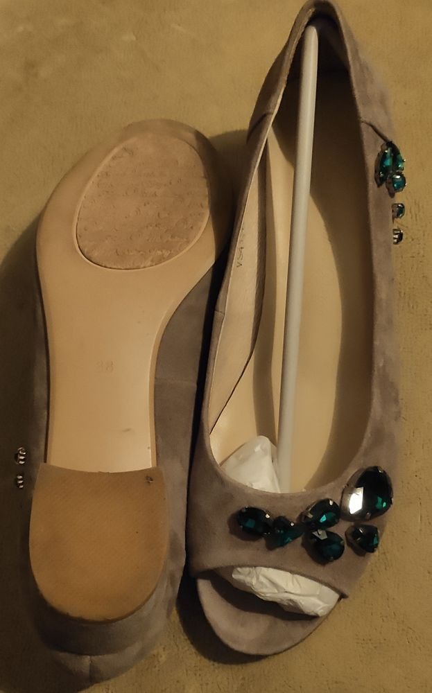 1 - Туфли р. 38 (но реально на узкую ногу 37 или 37,5). Экв. 2300 Состояние идеально. Надеты 1 раз на мероприятие. Цвет очень красивый нежно песочный, с крупными темно-зелеными камнями.