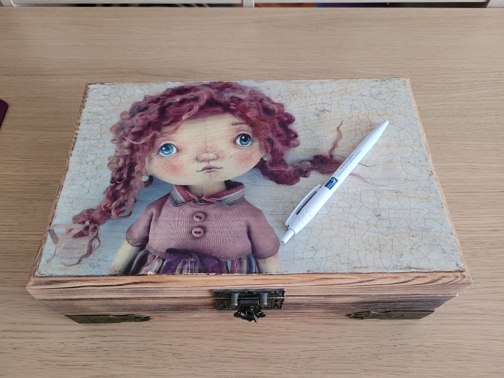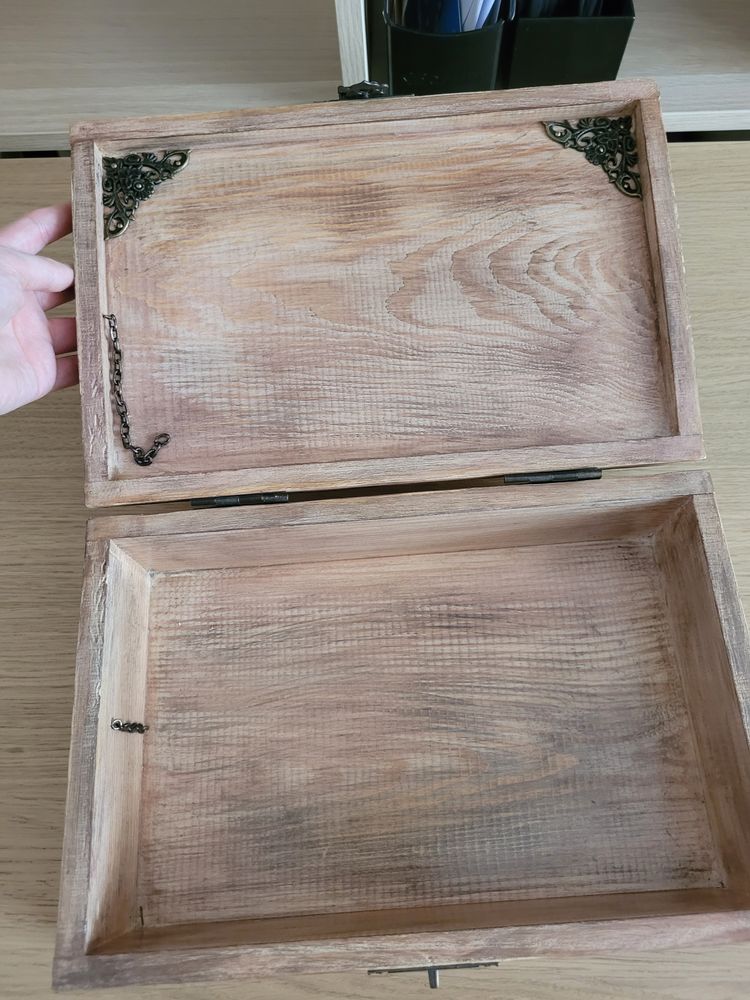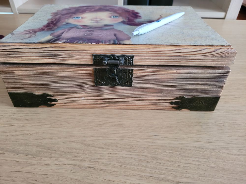 20. Шкатулка ручной работы. Вроде здесь меняла. Дерево. Видимо чуть рассохлась - крышка до конца не закрывается и цепочка внутри раскрепилась, на которой крышка должна на весу держаться - можно скрепить. Экв 1500 руб.