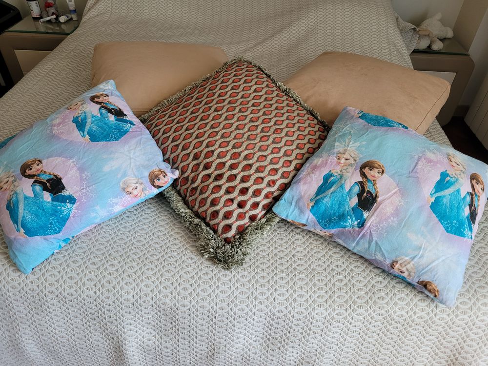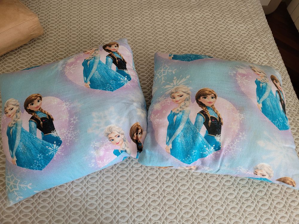 Подушки в детскую Холодное сердце. 45*45 примерно. лежали в детской на диване какое-то время. В прекрасном состоянии. Чехлы снимаются для стирки. по 800 руб. ОДНА ОСТАЛАСЬ