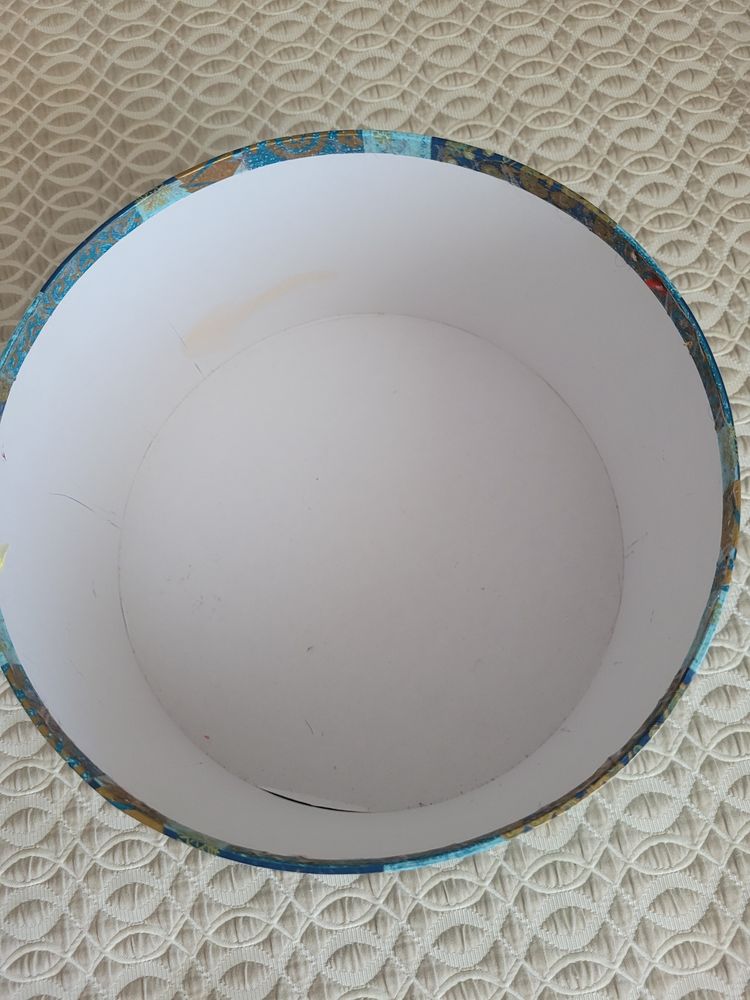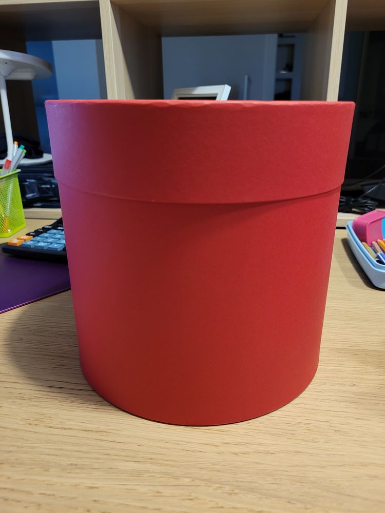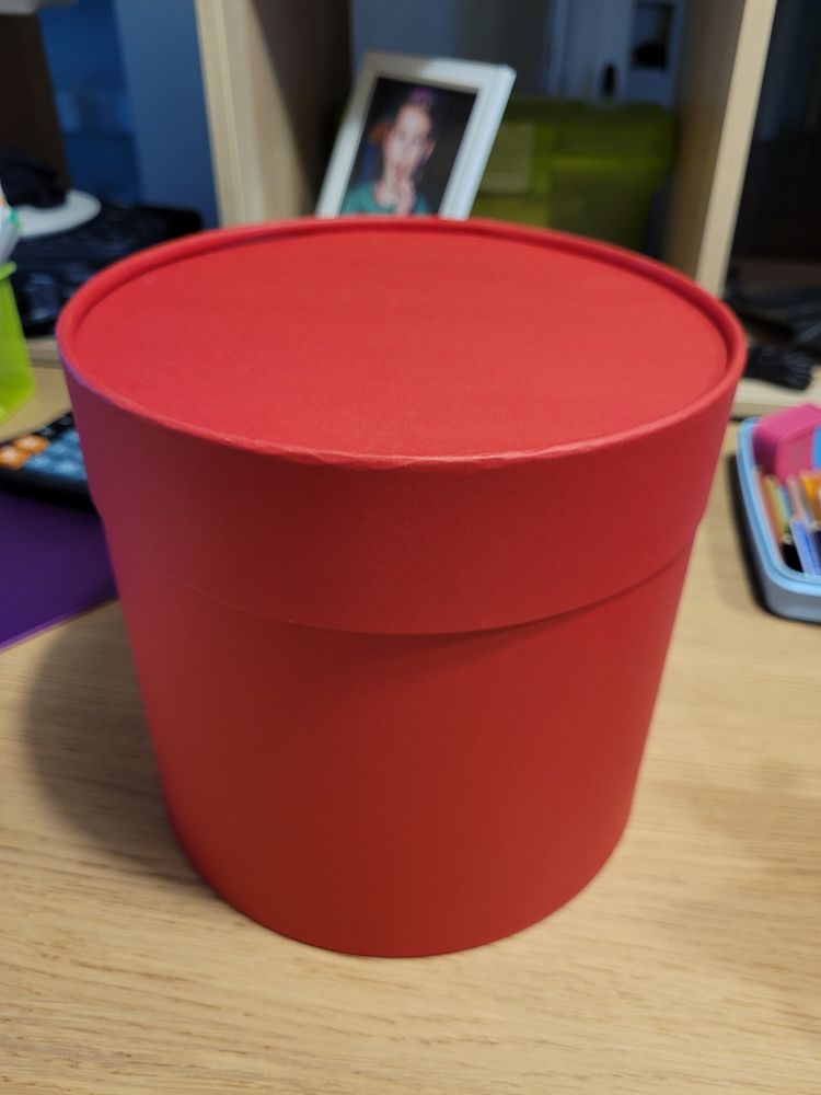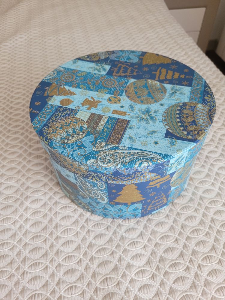 28. Подарочная коробка. Диаметр 23,5, высота 13 см. Для подарка не подойдет т.к. хранили в ней заколки всякие и внутри есть загрязнения. Снаружи все отлично. Экв 300