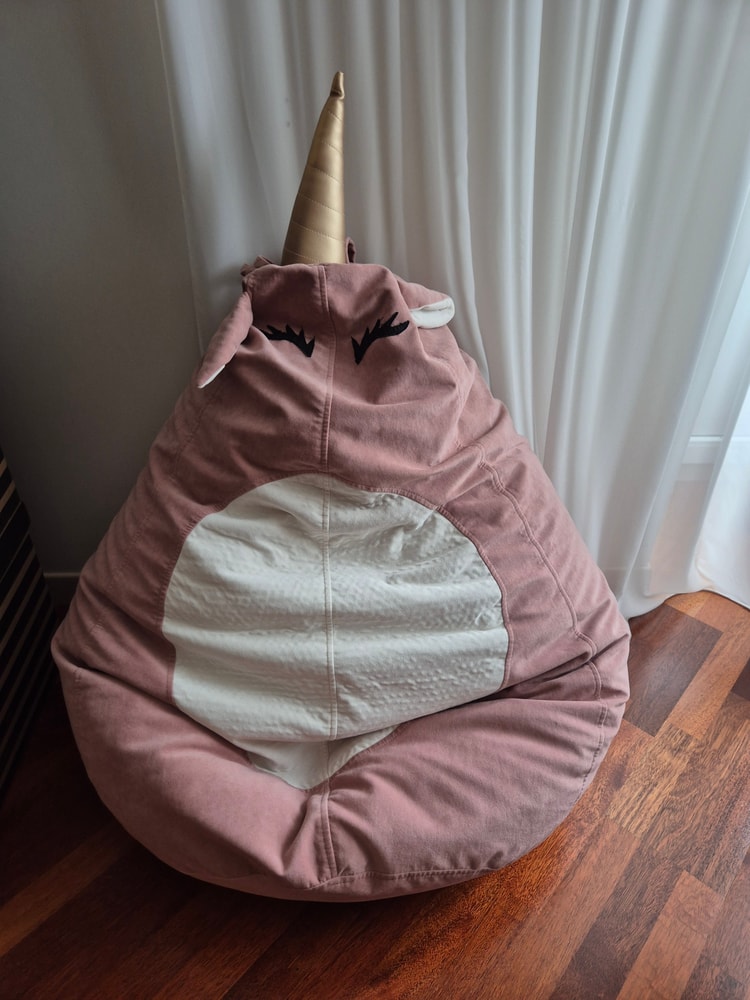63. Кресло мешок SoftPear. Чехол съемный, легко стирается. На ухе маленькое голубое пятнышко - не отстиралось на деликатной стирке. Может пятновыводителем отойдет. Оно не заметно практически. Дарили дочке в прошлом году. В этом году после ремонта уже не вписывается в интерьер. Стоило около 12 тыс. Ткань микровельвет. Уже нет таких в продаже. Наш Российский производитель, делают бескаркасную мебель. Экв 5500 руб.