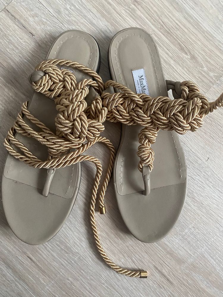 новые босоножки max Mara оригинал, маркировка 38, но стелька 25,5-25,7 см. Очень красивые, но мне малы. Завязываются вокруг щиколотки или по ноге выше. Экв 20000, стоили около 300 евро.