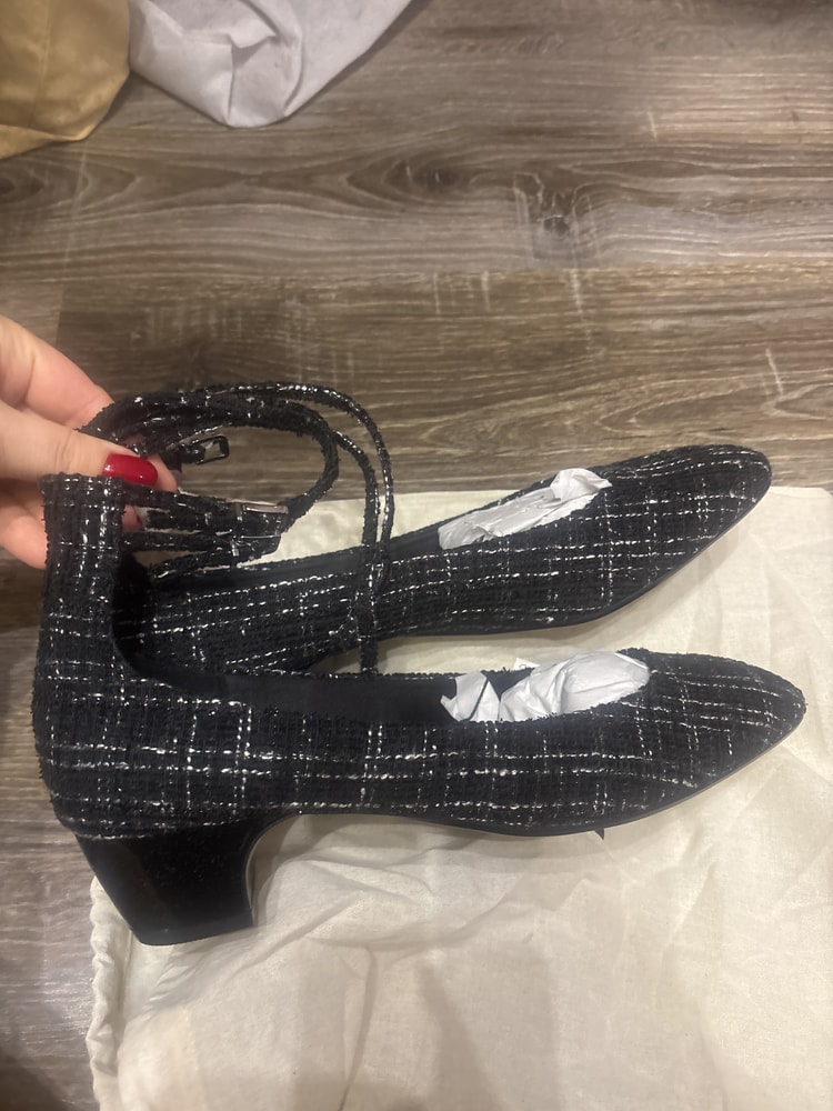 новые туфли Зара из твида, цвет черный с белыми вкраплениями. Низкий каблук 3-4 см, 2 тонких ремешка вокруг щиколотки. Маркировка 41, на Росс 40 (стопа 26,5 см) отлично. Экв 4500