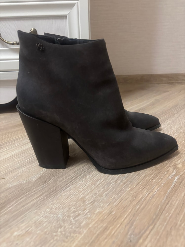 Заказывала из Америки, бренд shultz. Полностью натуральная замша, подошва пластик. Размер 9,5 на наш 40й. На ноге нереально красиво, но я с моим плоскостопием не могу носить такую шпильку без платформы.Экв 7500. Коробки нет, только мешок.