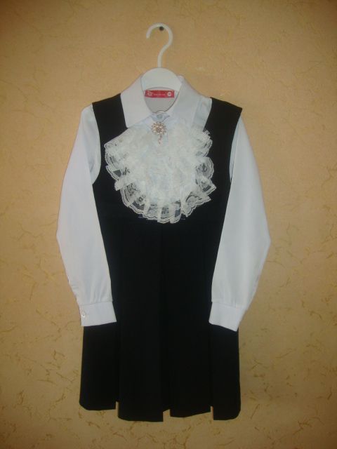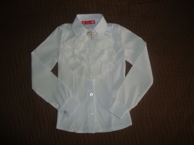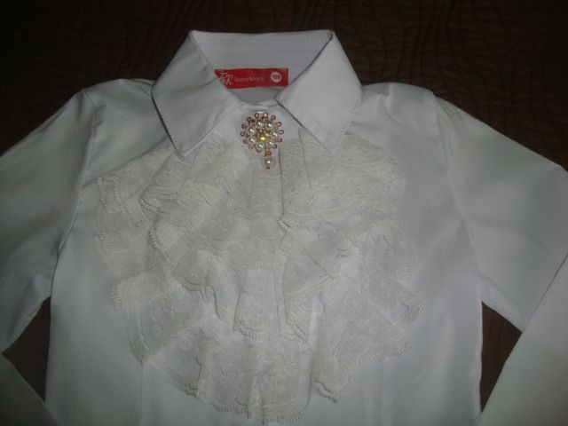 Блузку одевали всего 2 раза в 1 классе. Состояние идеальное. Брошка и жабо-отстегиваются.