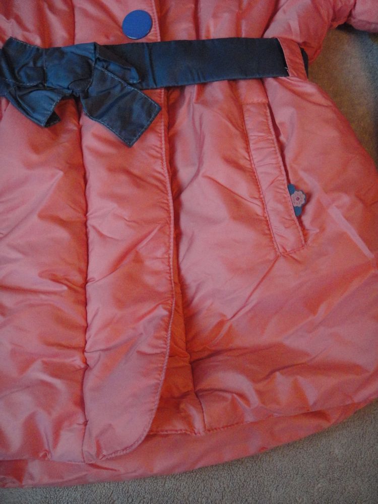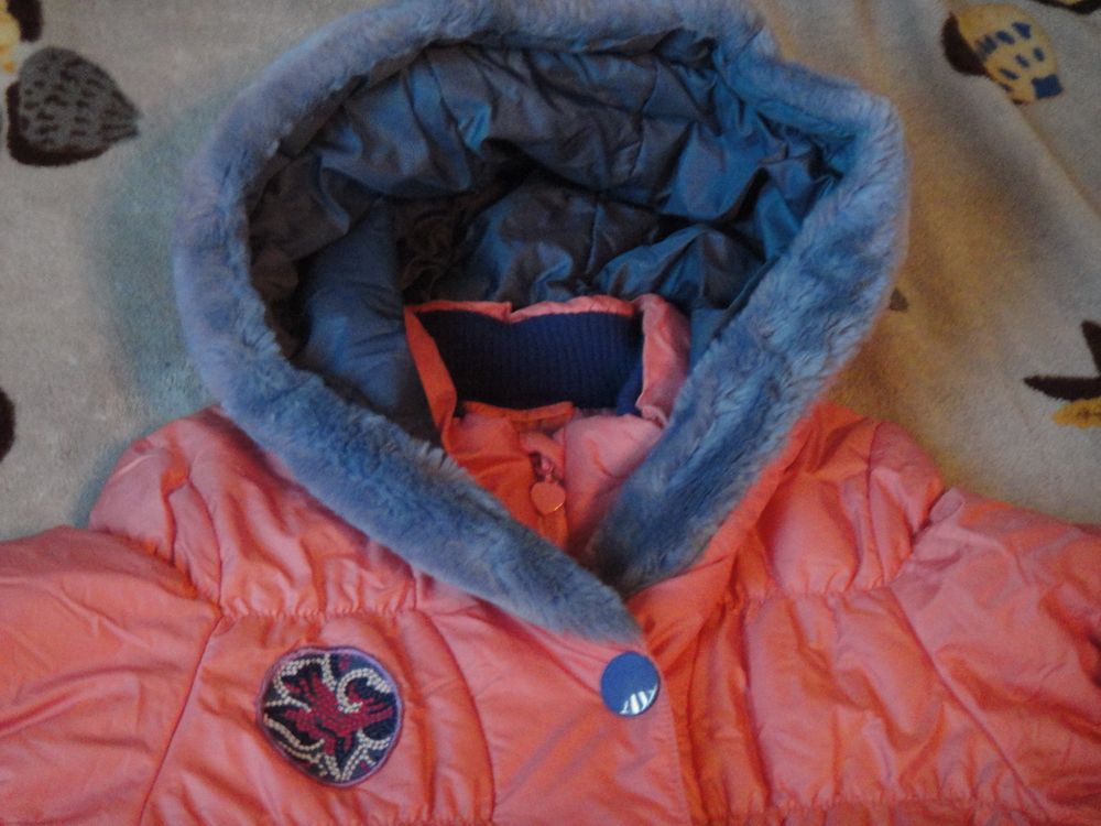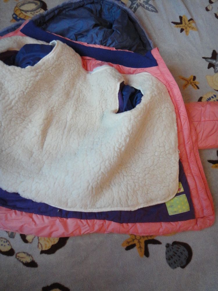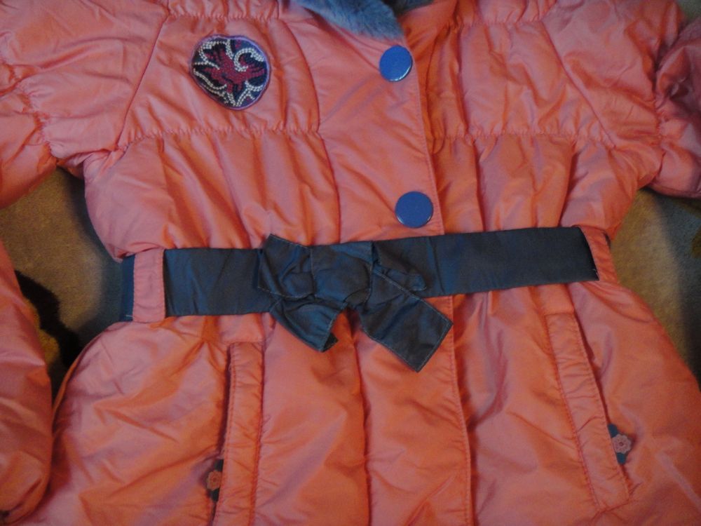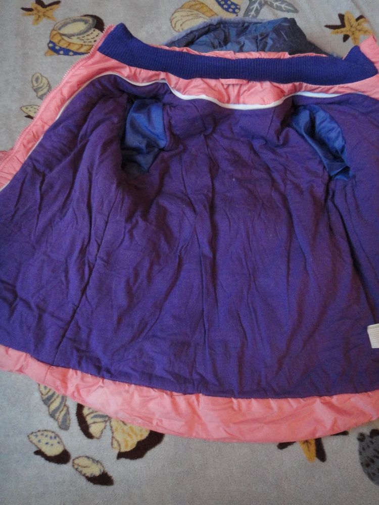 7.Зимняя куртка Oldos со съемной подстежкой, р.134. Цвет - розовый с сиреневым. Верх - 100% полиэстер, подкладка - хлопок и полиэстер. Застежка - молния и планка на кнопках, пояс на кнопках, капюшон с мехом, 2 кармана, трикотажные манжеты и воротничок для удобства и плотного прилегания. Длина - 64 см., рукав от плеча- 60 см., от подмышки - 46 см. Экв. 2300 руб.