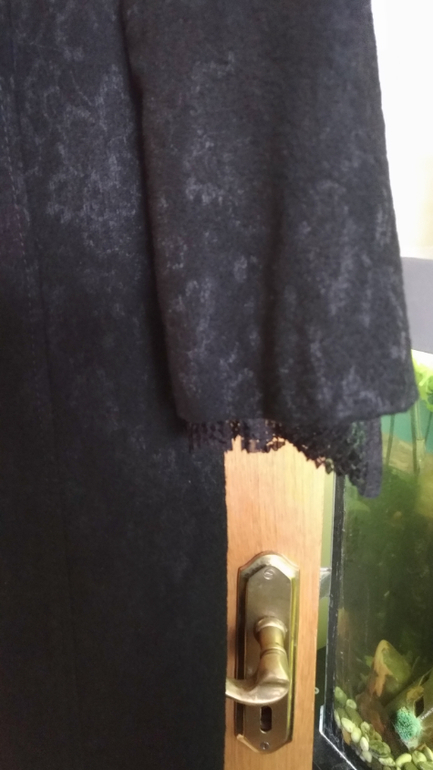 Ткань с содержание шерсти. Тонкое, но очень красивое. На груди и рукавах кружево.