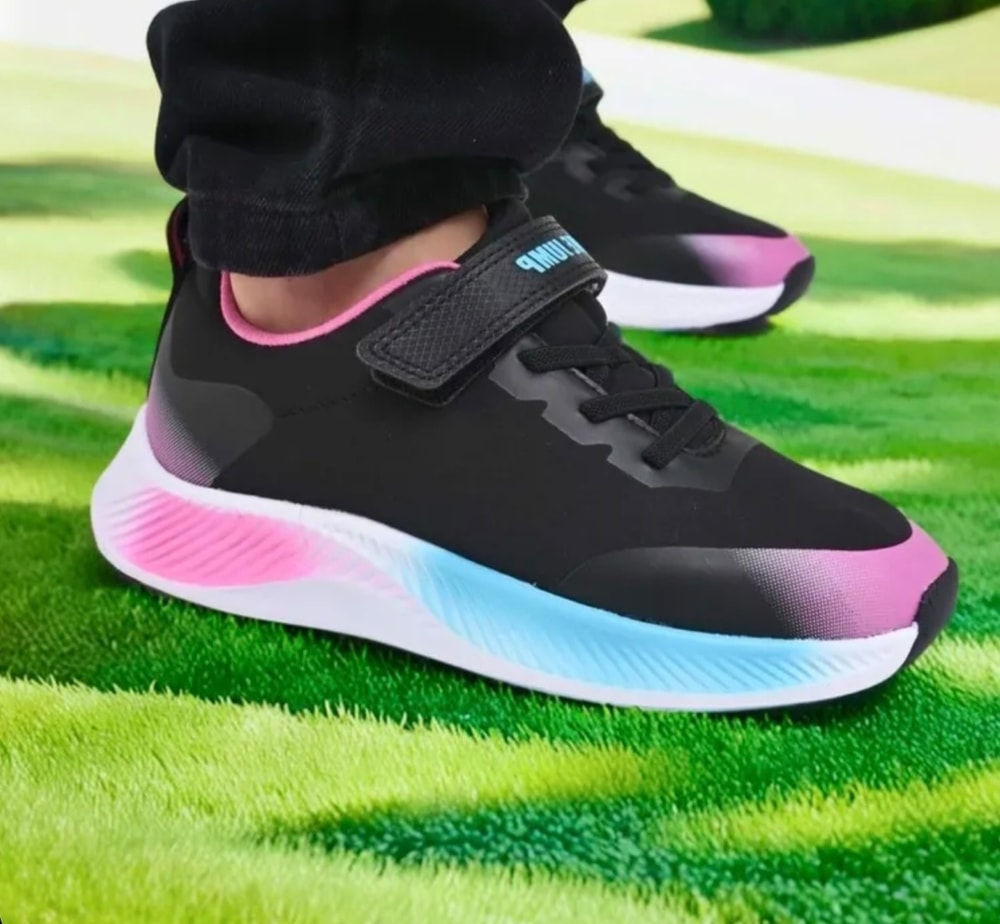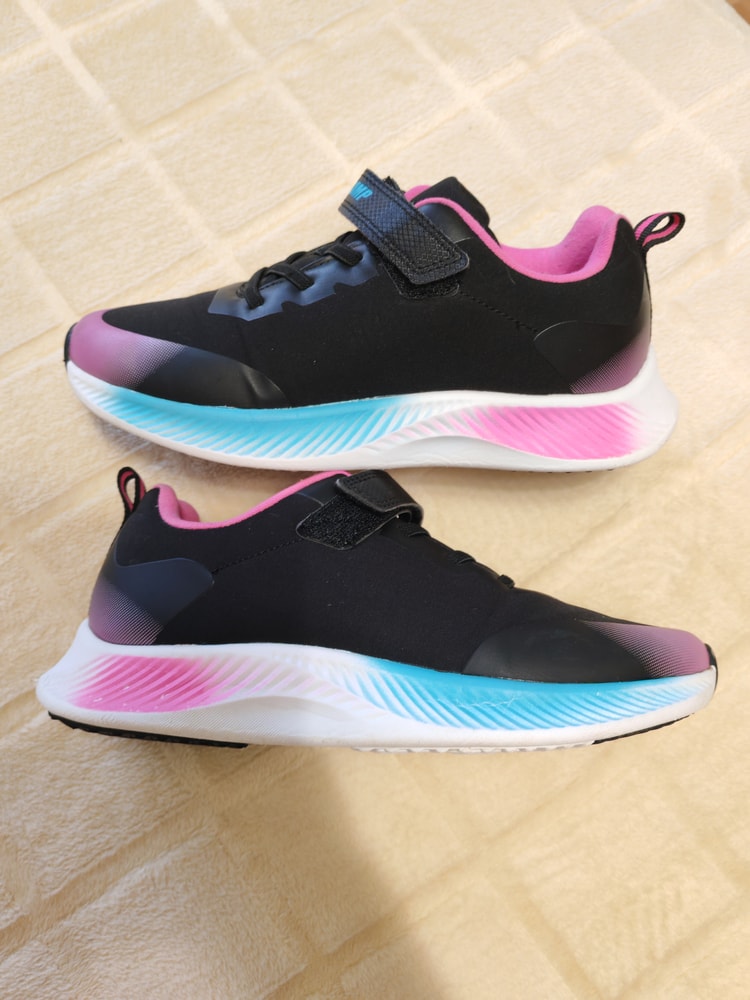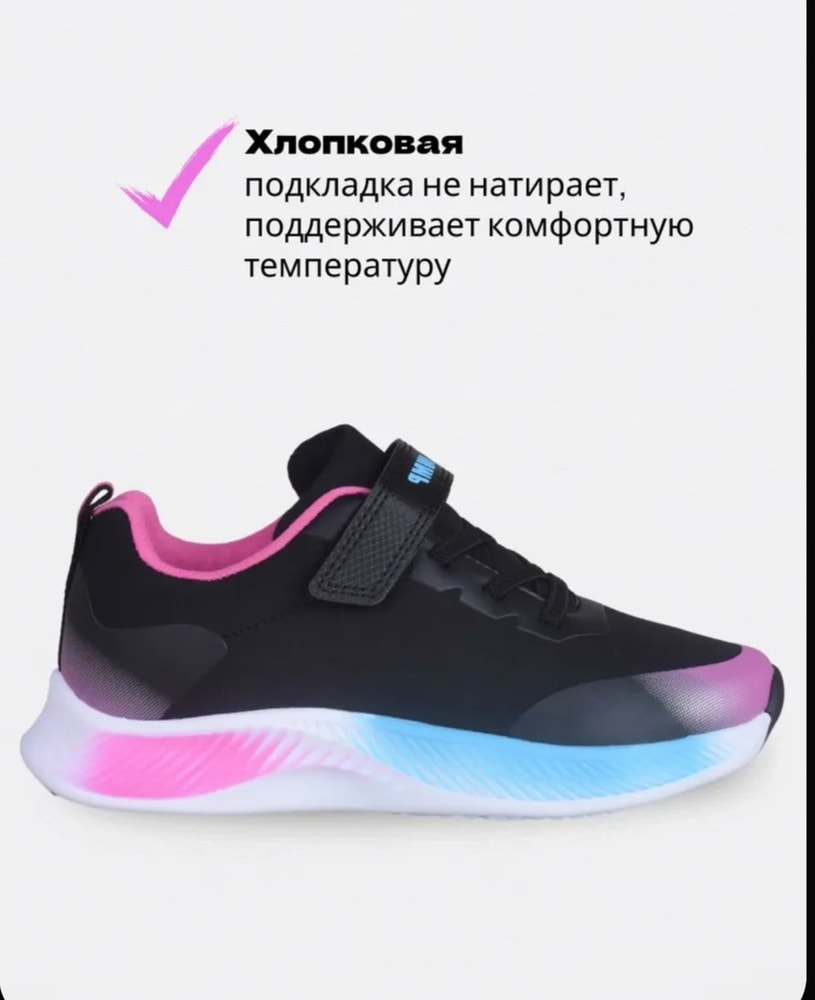 Выполнены в стильном синем цвете с яркими розовыми и черными элементами. Удобная модель на липучке обеспечивает комфорт при ходьбе. Подошва белого цвета добавляет контраст и стиль.