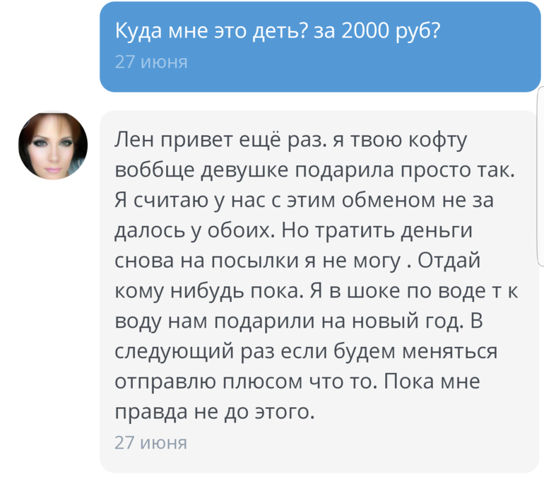 Весь "сыр - бор" теперь в том, что Ксения мне не верит, что такое вообще могло произойти. Я не просила вернуть мои вещи обратно. Но хотела бы, чтобы мне как-то возместили мои 2000 руб. О чем я ей и сообщила.