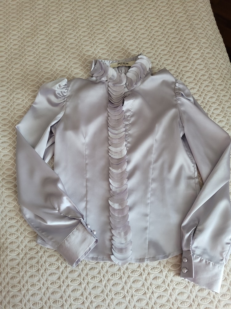 152. блузка укороченный рукав. В отличном состоянии. Стильно смотрится, все пуговки потайные кроме верхней стразинки. Сзади на спине складка, красиво с узкими брюками/юбкой на выпуск. 1500 руб.