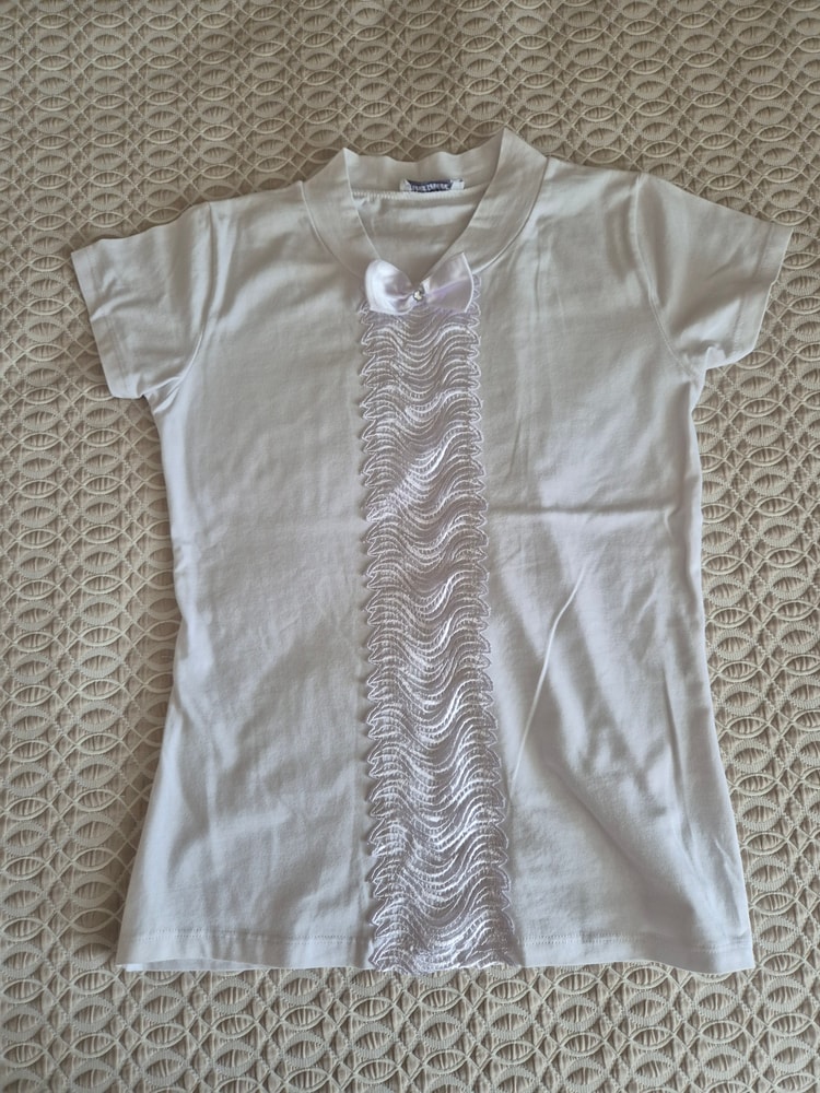 162. Переобмен. Школьная футболочка турецкая. Хорошее качество, носили такие. На 158 рост примерно. Экв 500 руб.
