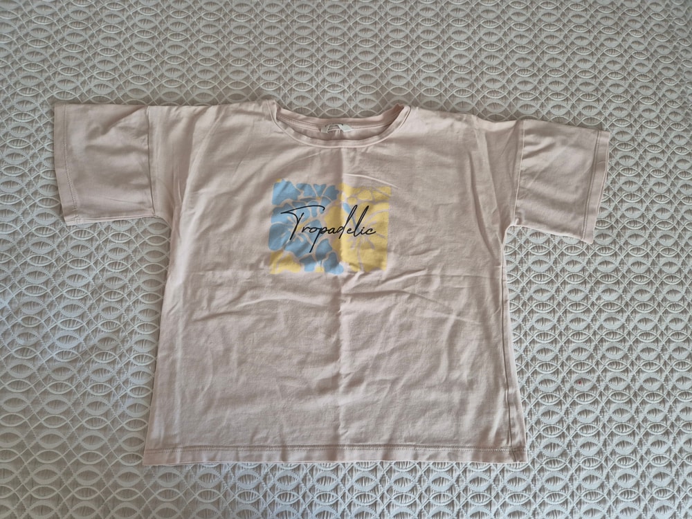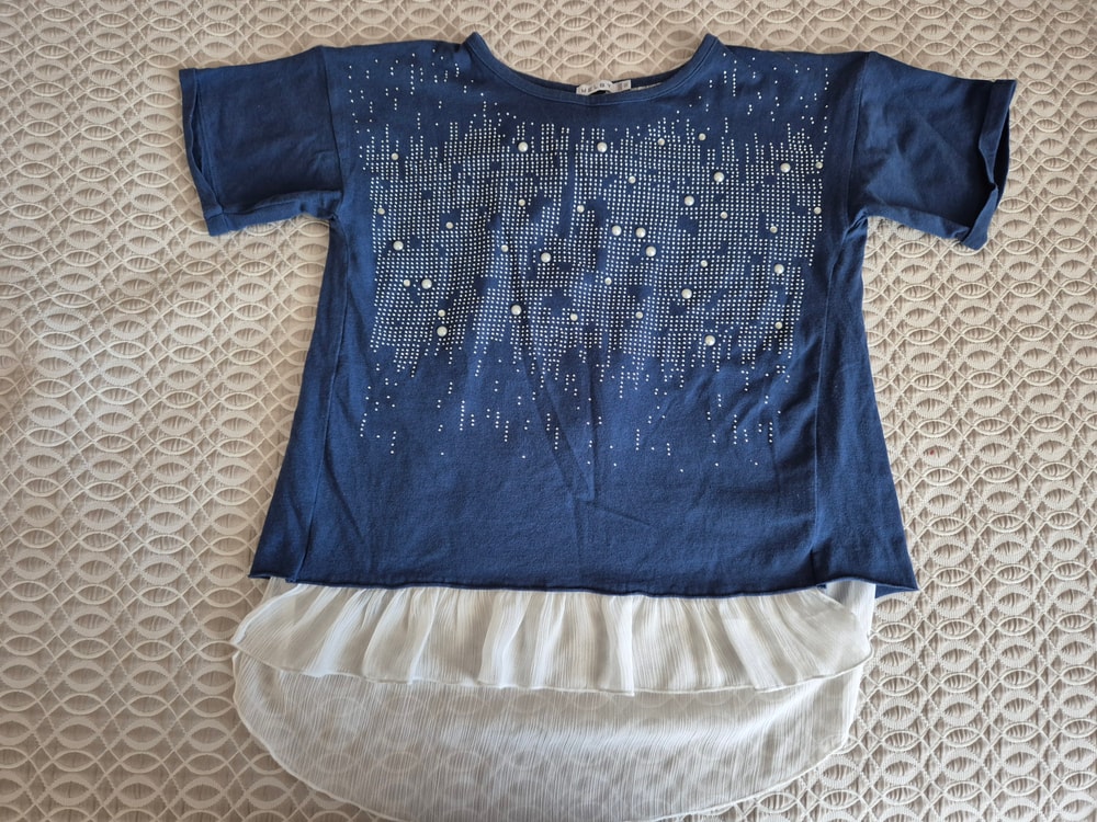 129. Футболка Майорал. Размер вроде 122, но можно и на 128 и на 134 даже. Была любимая. Вроде 10 страза не хватает. а так все отлично. Экв 500 руб.