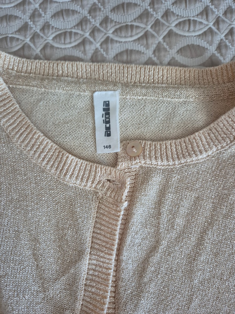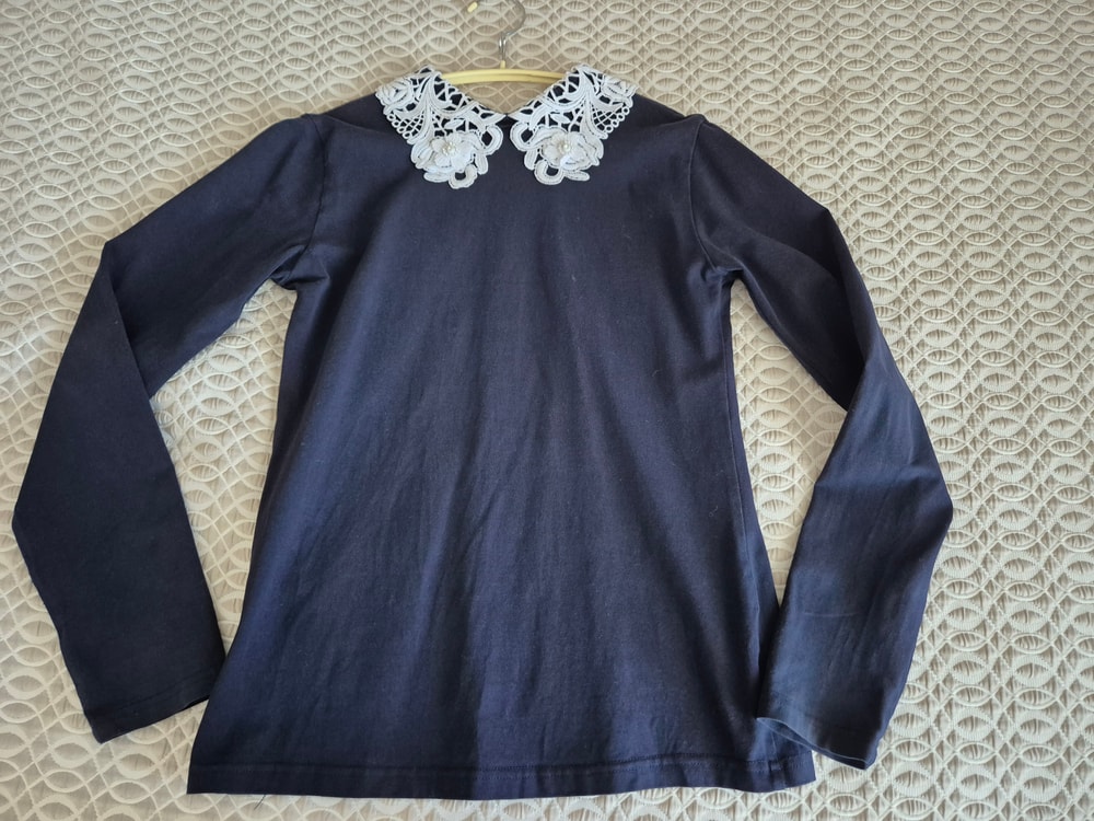 140. Кофточка школьная на 134 рост. Ношена мало. Красиво смотрится. Дочка снимая чуть потянула и разошлась не много ткань на сгибе где пуговка. Зашила, в носке совсем не видно - фото 900 руб.