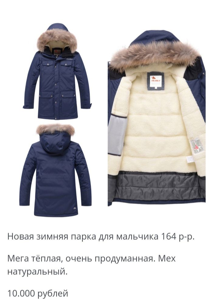 Парка 164р, цвет темно-темно-синий, зима, всё продумано до мелочей, надевалась редко в течение одного сезона, из нюансов-чуть окрасился подклад внутри от джинсов, меха нет, он был куцый, сразу сняла (поищу если нужно), (менялась новой за 10 000)
