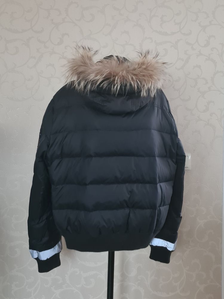 Классный пуховик Iceberg, маркировка xl, но лучше на L, на мой взгляд, на рукавах светоотражающие вставки, лёгкий, тёплый, удобный, пора сделать химчистку, освежить, мех съемный, экв 13000=