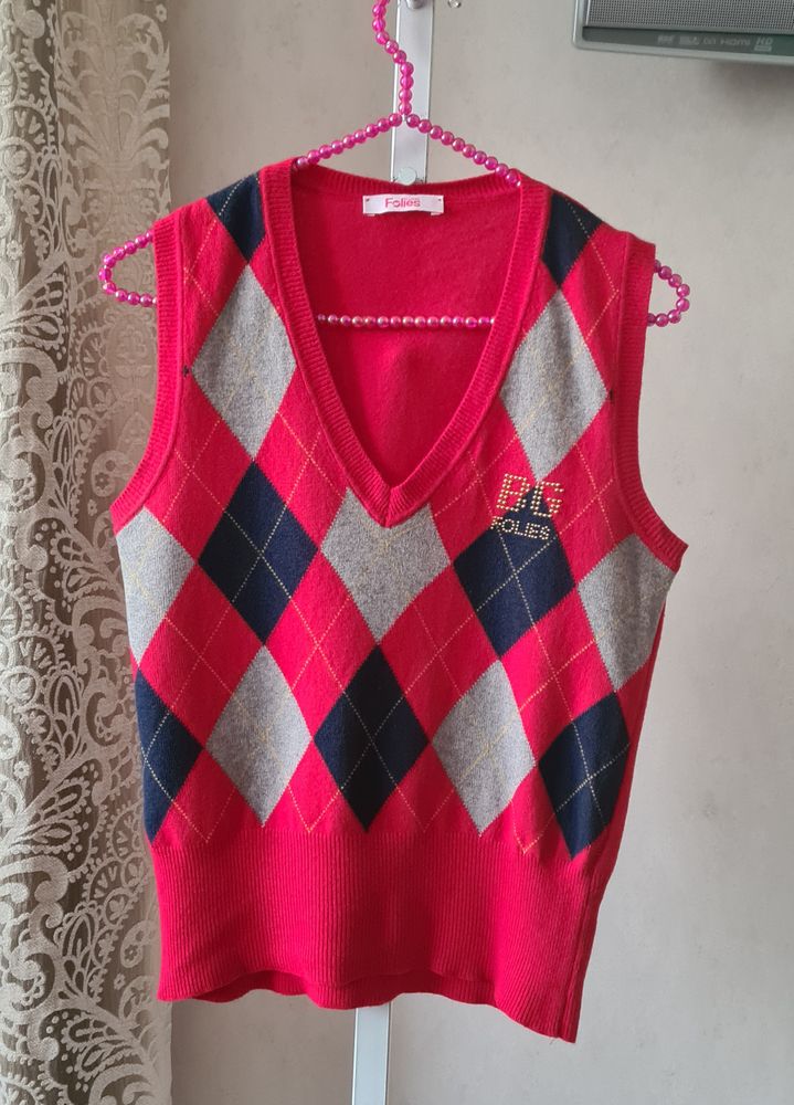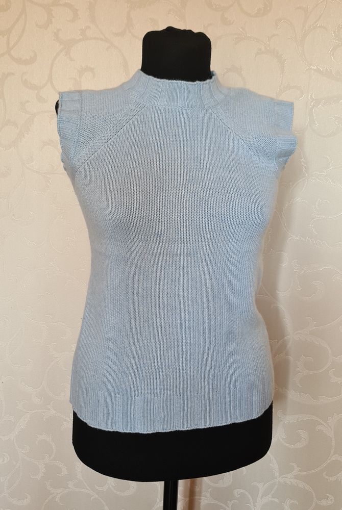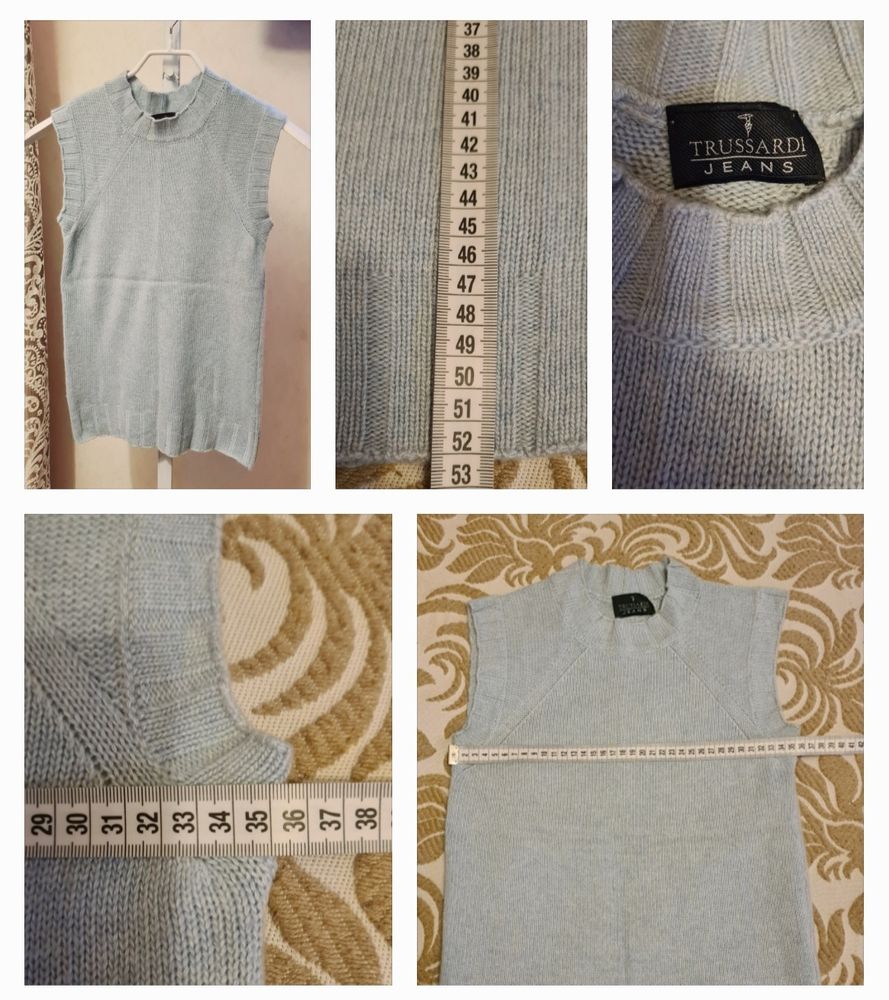 Жилет Trussardi, цвет нежный серо-голубой, не помню, чтобы надевали, бирка срезана с составом, но это хлопок-шерсть, маркировка XS, 1900=