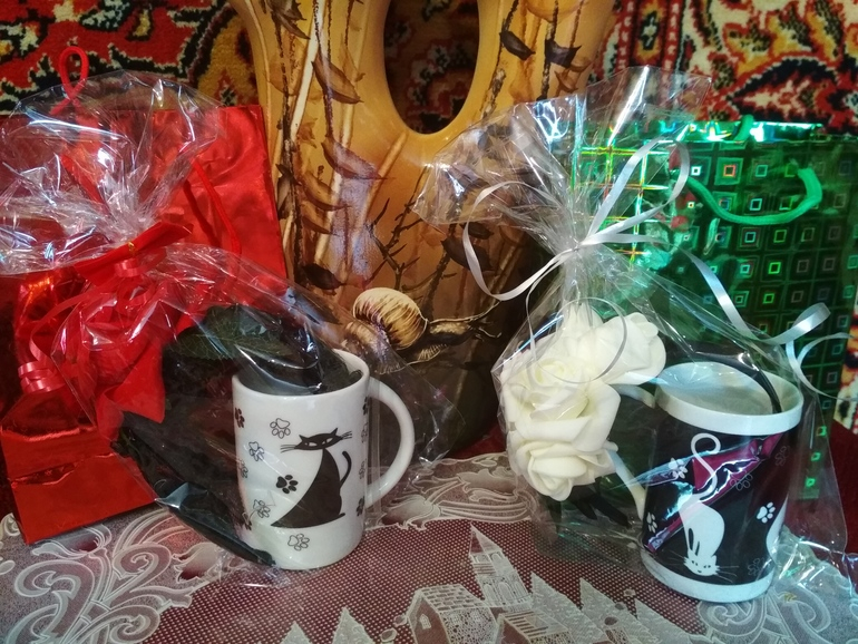 С моей стороны новый френчпресс в полной комплектации, новые металлические креманки (хоть и с нюансами - было изначально описано в посте) и отросток с корнями. По 1-й единице еще остались в посудном посте, можно посмотреть и почитать. Со стороны Людмилы б/у малая доска для глажки, 2 новые недорогие метелочки для пыли и вот эта кружка.