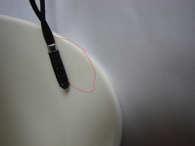Но это не все. Больше половины поверхности кружки покрыто желтыми пятнами, несколько нашла внутри на ободке: она откровенно б/у, а меняла Людмила, как новую и за 450-500 р. экв. Тоже все на фото ниже. Обвела, увеличивайте фото, смотрите снизу экрана вверх, так их лучше видно. На черной стороне отсняла 2 примера, на самом деле черная часть кружки покрыта разводами вся.