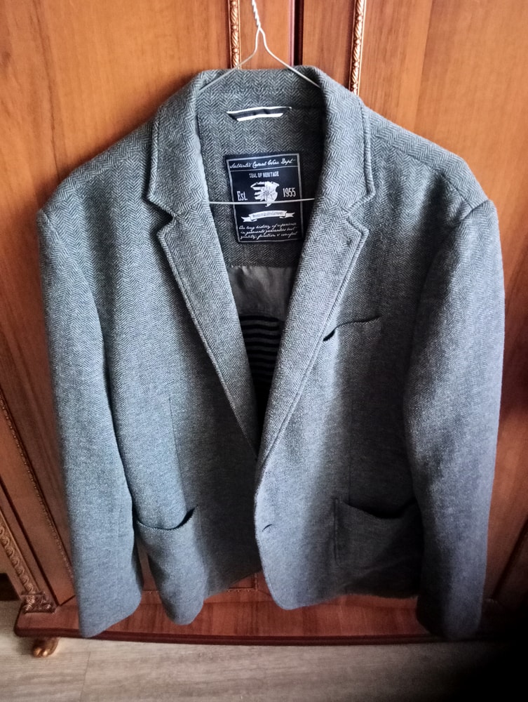 МУЖСКИЕ ВЕЩИ(одежда, обувь)Экв.7500 руб.Москва.почта,зеленая ветка. Новый фирменный шерстяной пиджак 54 размер. Этикетки срезаны, сейчас стал мал в плечах.