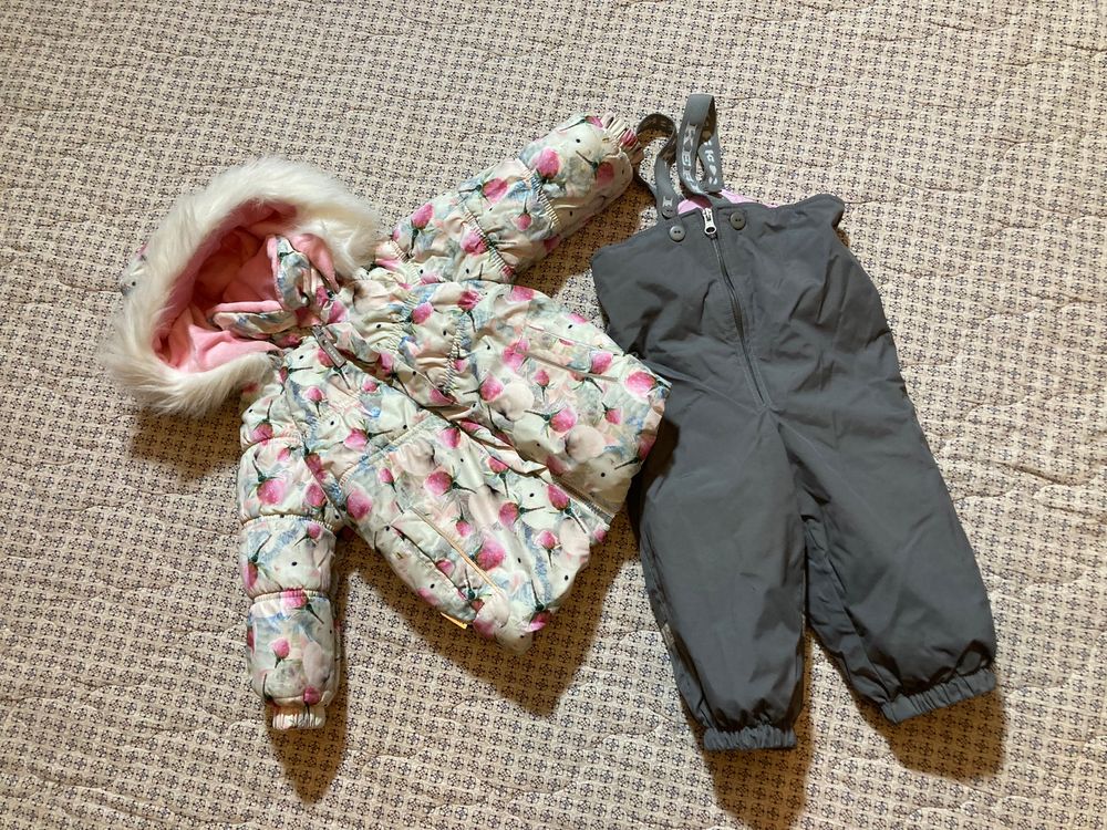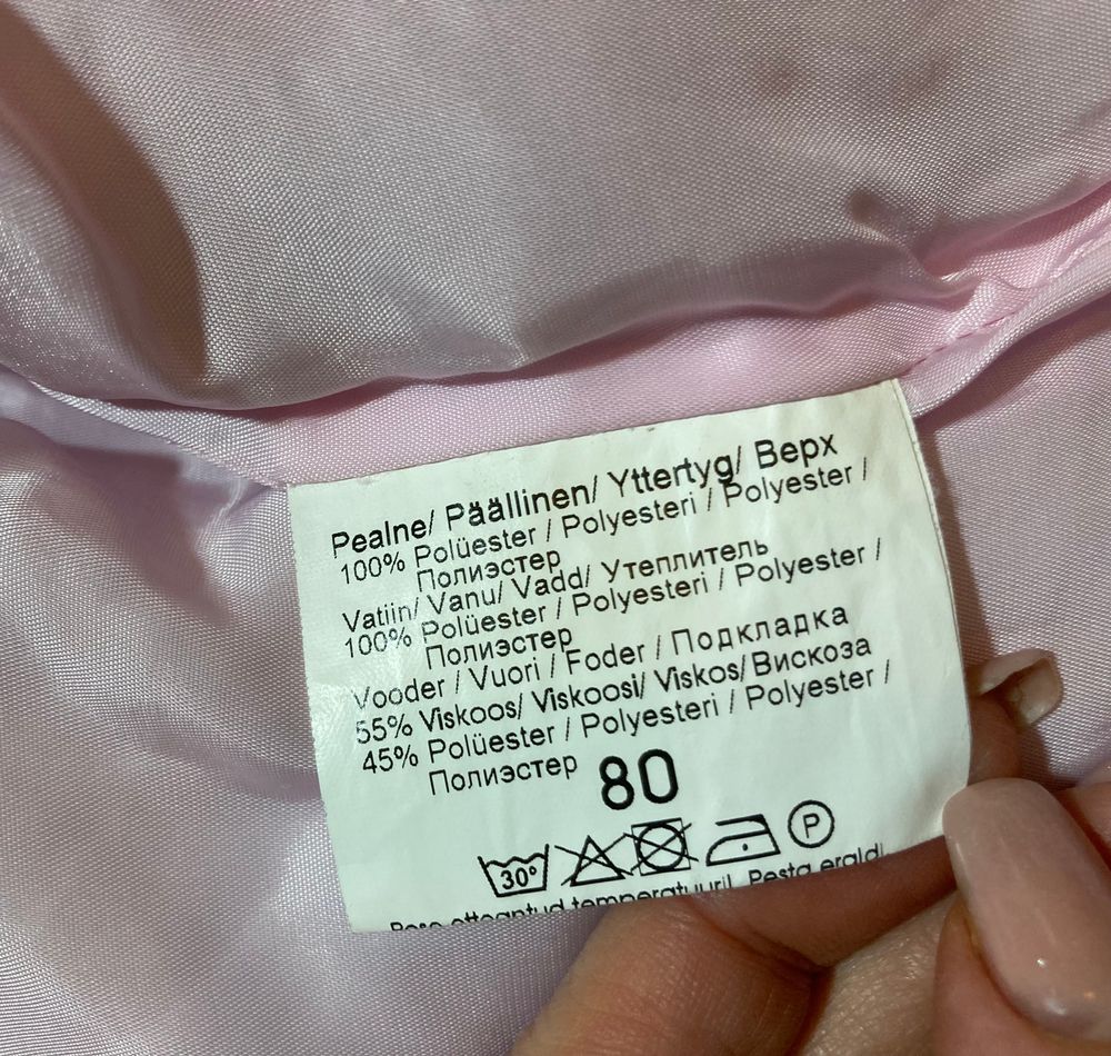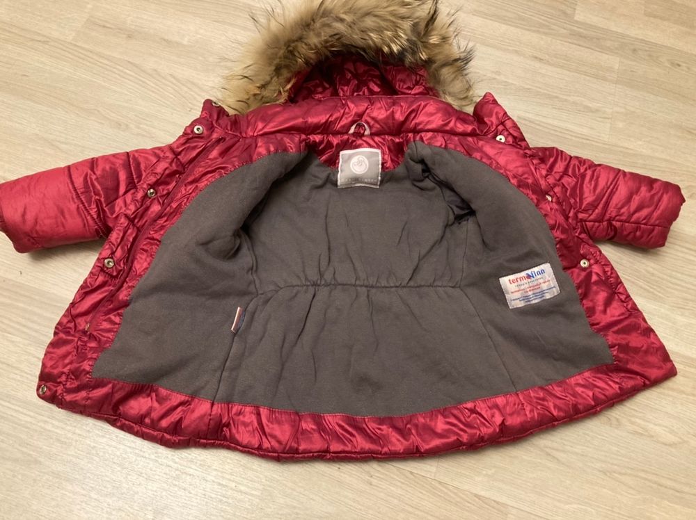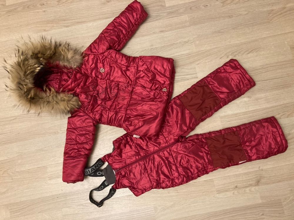 Есть ньюансы, на куртке нижней кнопки нет ( но она особо не функциональна), на брюках поставлены заплаты на коленях в цвет (на фото на ребенке, они уже стоят), маленькая дырочка зашита сбоку, небольшие потертости внутри брюк снизу. Цвет более малиновый, чем на фото, костюм очень эффектный. Шаговый-43 см, длина куртки-47, на стройную или среднюю девочку. Экв. 1000