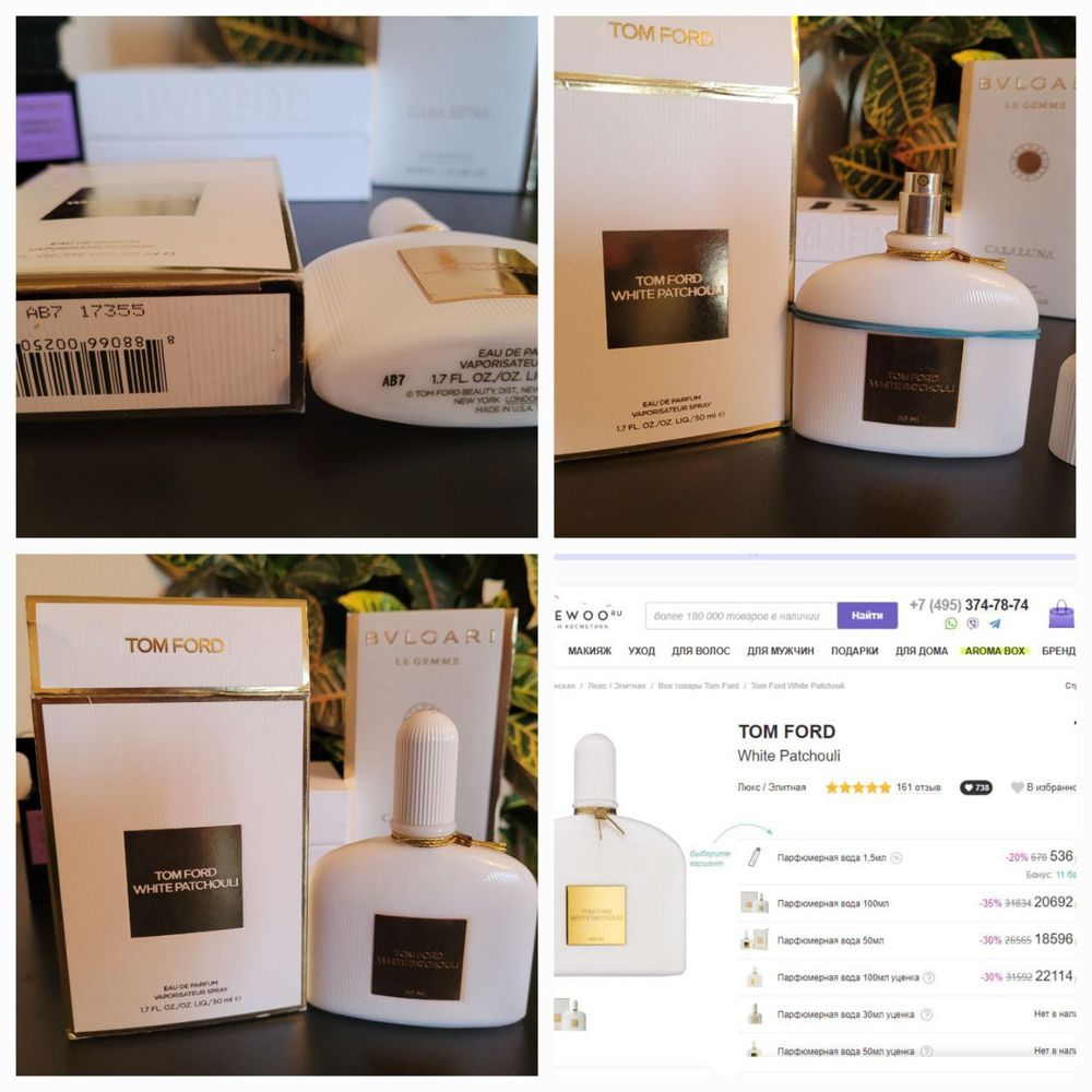 2. Tom Ford White Patchouli (Белые Пачули). Флакон 50 мл, остаток обозначила резиночкой. Остаток во флаконе около 40 мл. Полный комплект в коробке. Эквивалент 14 тысяч.