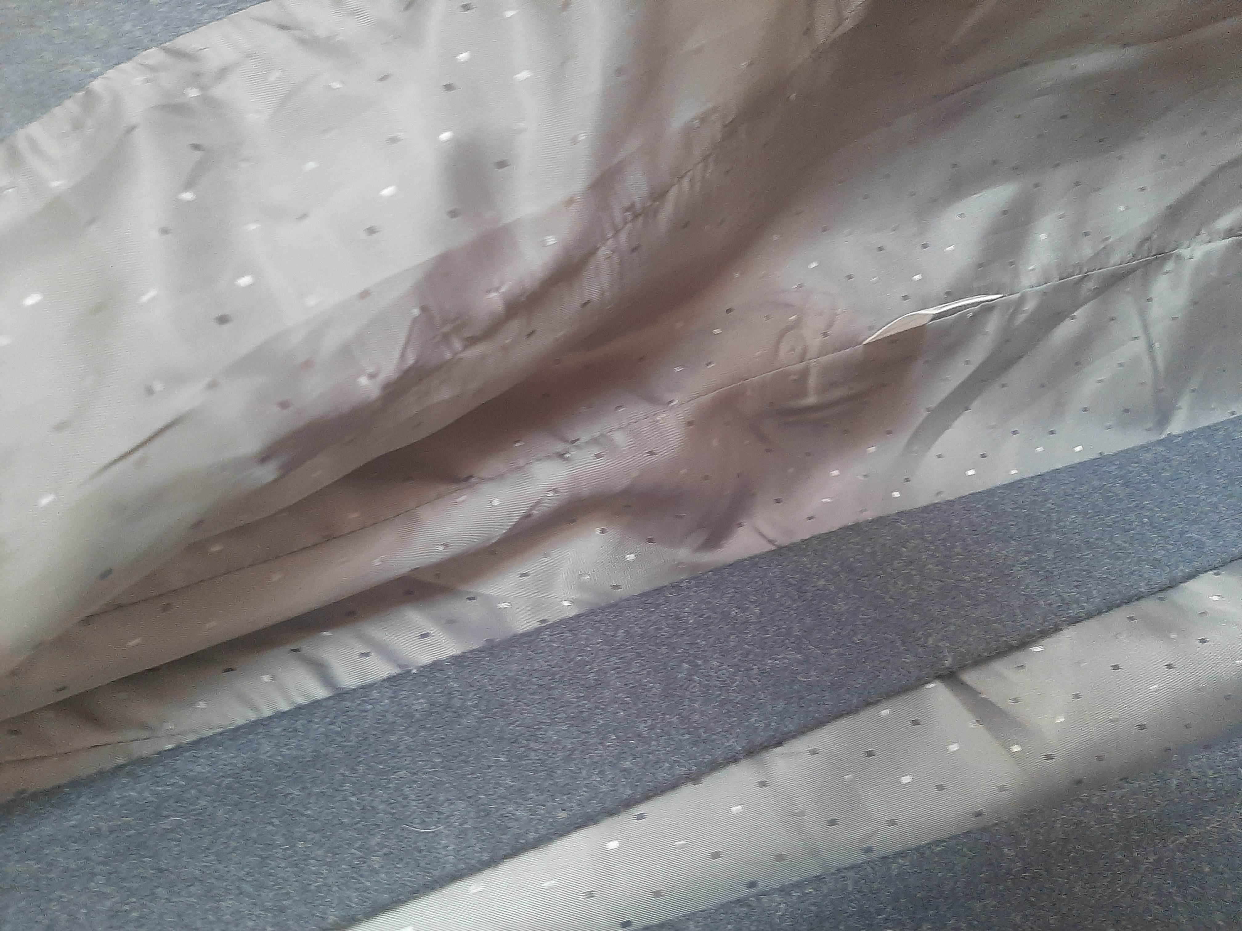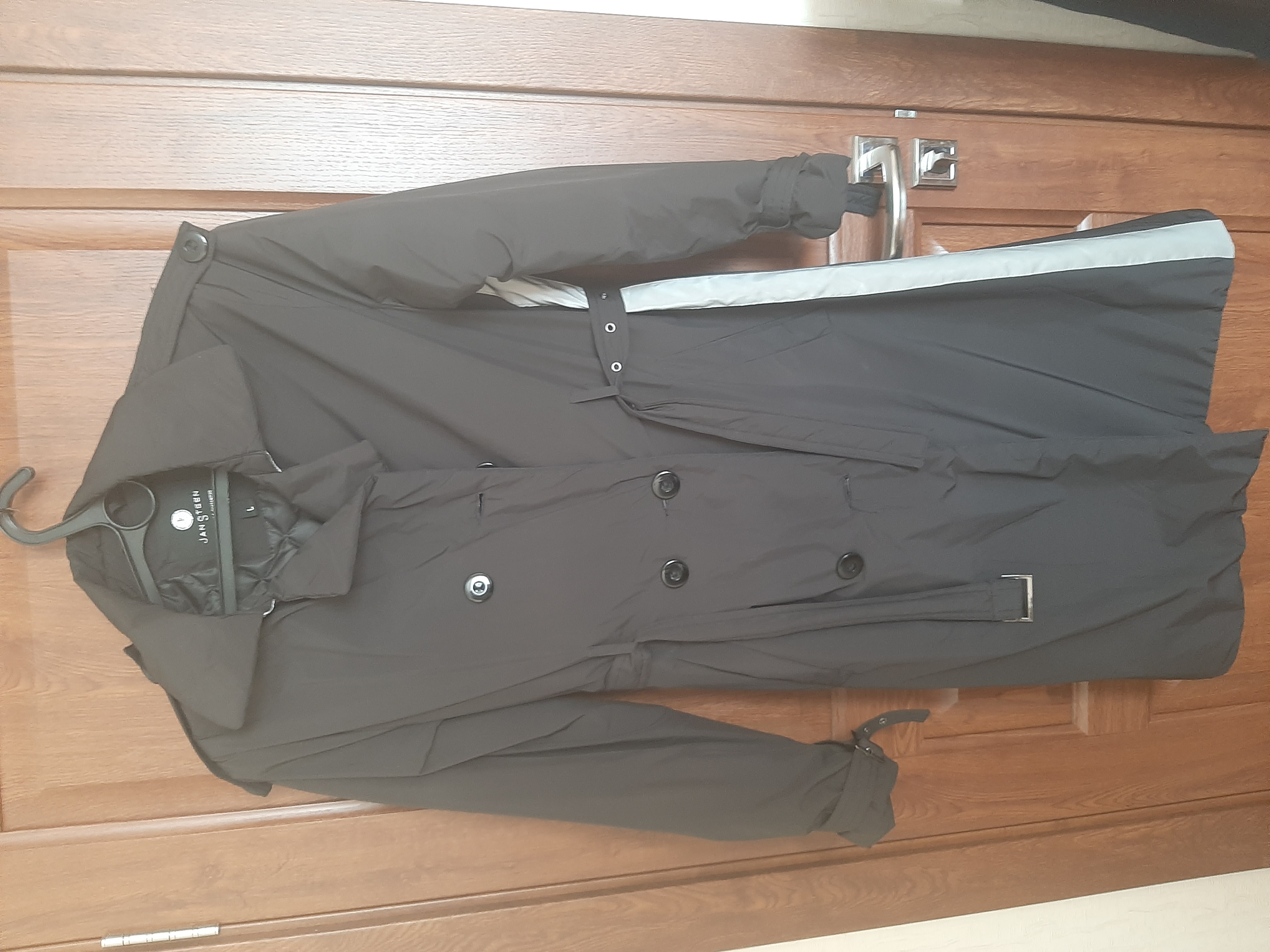 Демисезонный утепленный тренч, по бокам и под воротником световозвращающая лента. Есть небольшой недостаток-на фото- слишком горячий утюг. 46-48, 2000