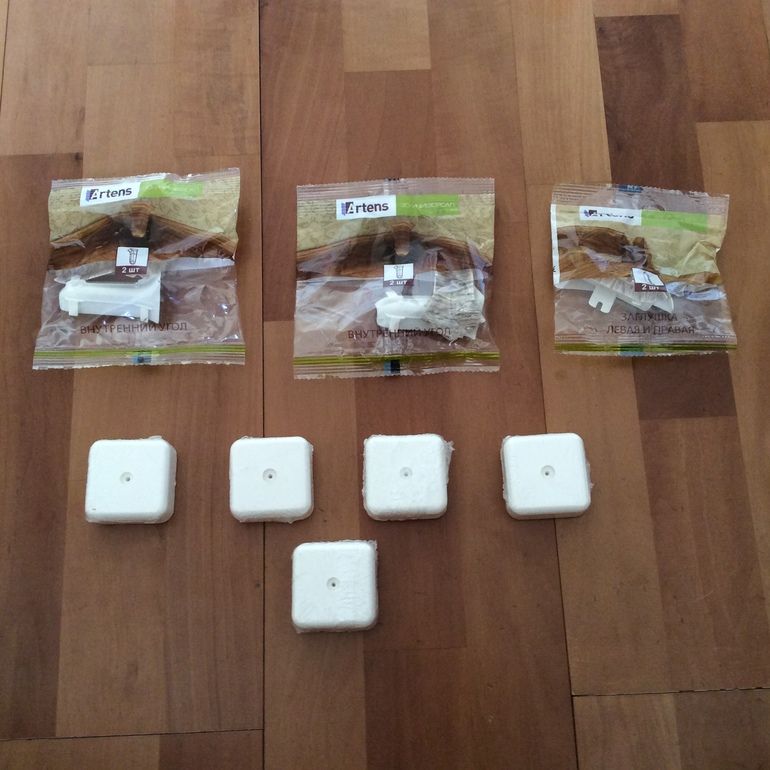 4)Заглушка левая и правая, Экв 30 р ; внутренний угол, Экв 35 р ( все цвет -Равенна); коробка распределительная 50*50*20, Экв 20 р.