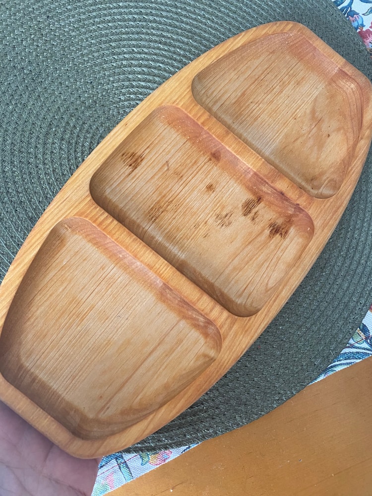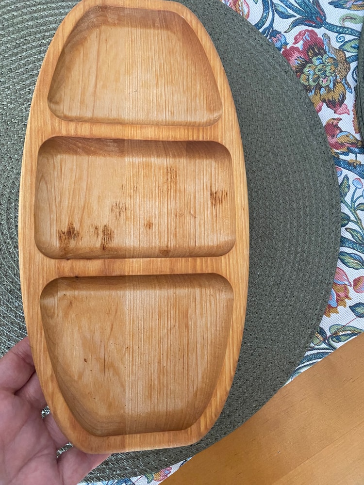 Менажница натурального дерево береза, не использовала, попробовала нанести масло черного тмина, но нужно еще пару раз, для равномерного цвета. А вообще можно любое минеральное масло экв. 500
