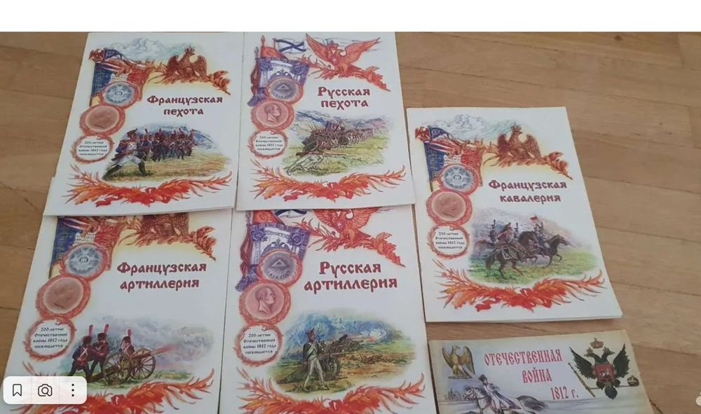 Набор книг о великой отечественной войне 1812 года, с расскрасками. Подошёл бы на подарок. Но в одной книге расскрашена 1 страничка. Французская кавалерия,французская пехота, русская пехота, французская артиллерия, русская артилеррия