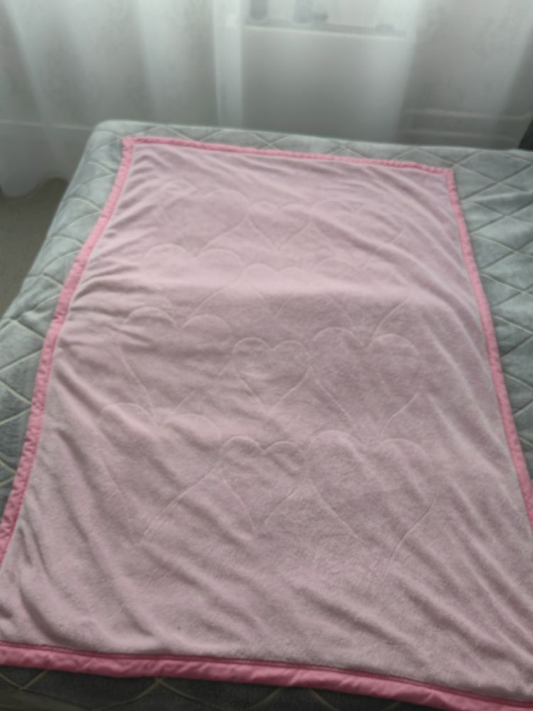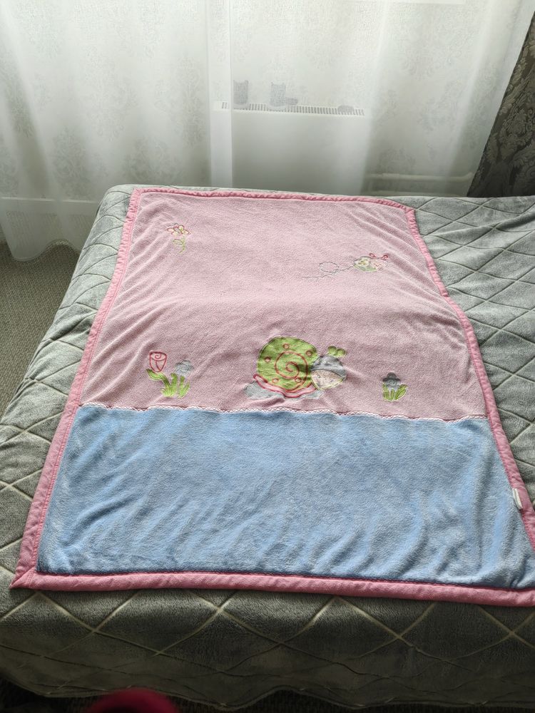 Покрывало-одеяло 140*95см. Очень мягкое и теплое. Б/у есть небольшие недочеты: небольшое пятнышко, зацепка, а так же после стирки немного съежился рисунок и из под него вылезла пленка, возможно можно исправить, одеяло все равно очень теплое и классное. Эквивалент 650 руб