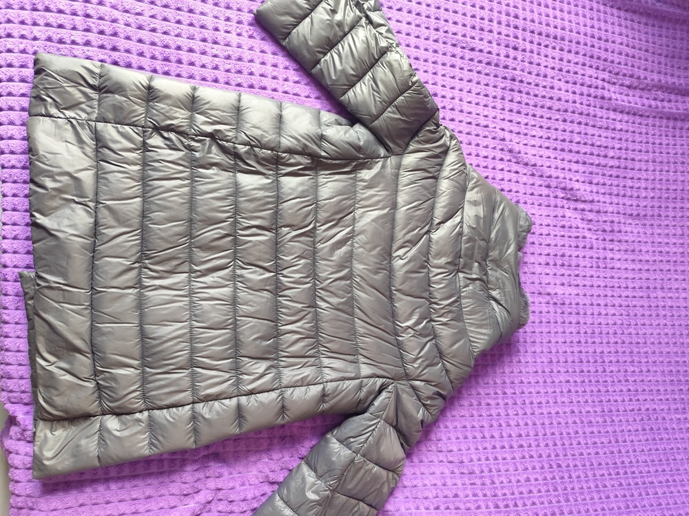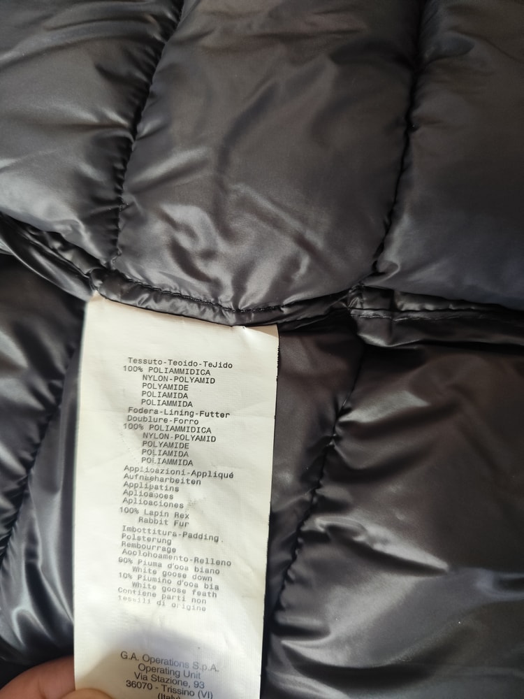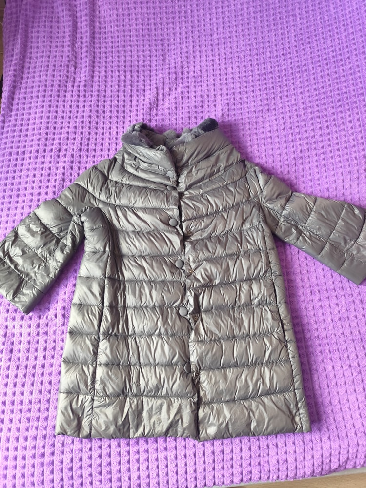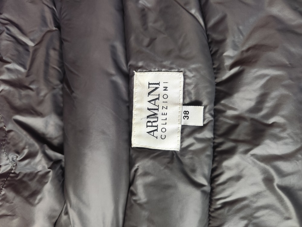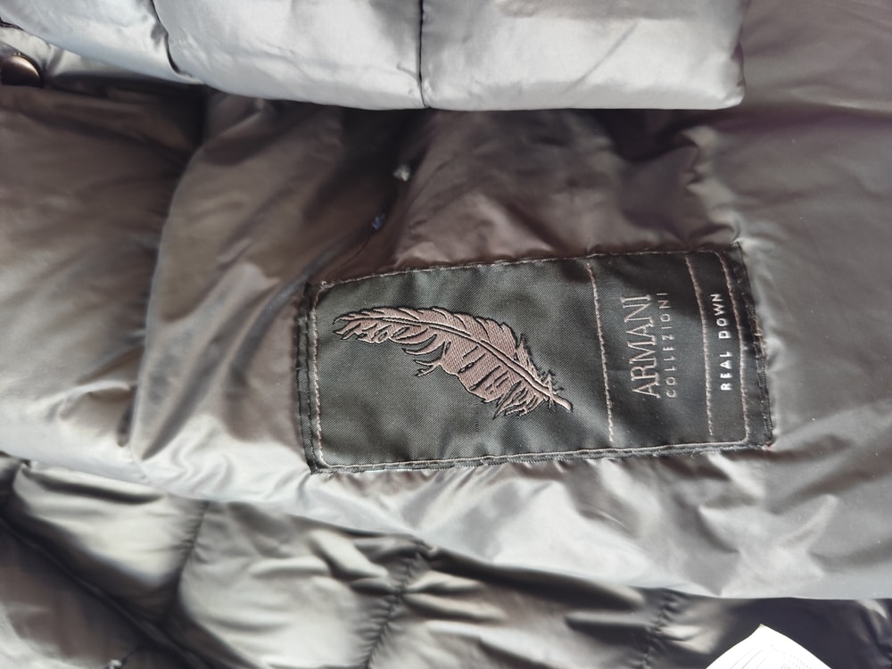 Пуховик Армани, цвет мокрый асфальт, рукав 3/4, очень лёгкий и уютный, воротник мех кролика, карманы на молнии.