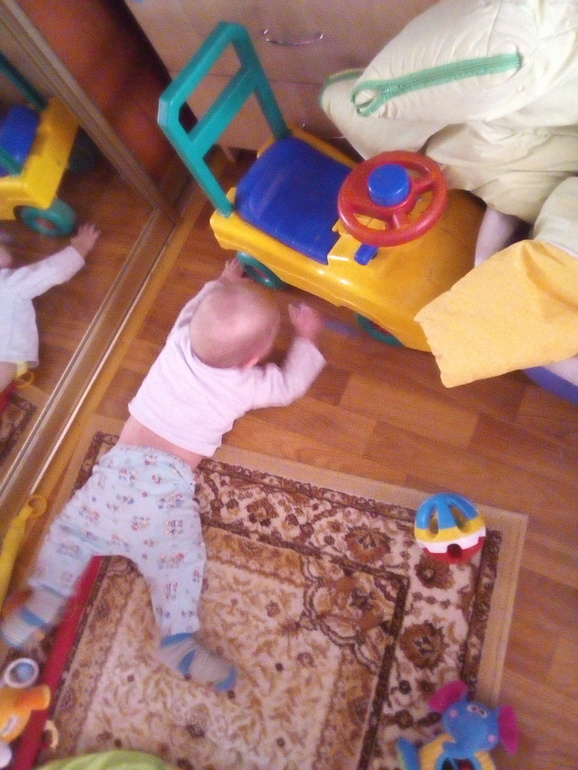 Сейчас ползает, носится как таракашка, немного ходит вдоль опоры, активный. любит брата, машинки, животных. Всем интересуется, кричит, визжит из коляски, если что то интересно. Вся тянет в рот. Что-нибудь отнимешь- плачет)))