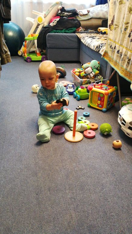 Собирает пирамидку, у него из 2, очень любит, когда читают ему книги, стишки детские и песенки слушает.
