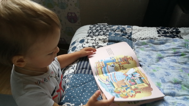 Виктор Романыч обожает книги, слушает очень внимательно. Потихоньку начинаем показывать мультики по 10 минут в день. Любит музыку, детские песенки, сказки аудио