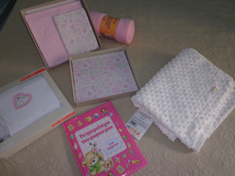 2 одеяльца, постельное белье, Полотенце-халат с капюшоном и первый дневник для девочки на греческом.