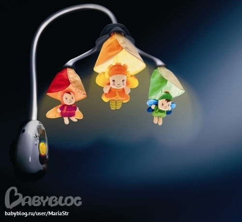Сначала хотела другой мобиль. Фишер прайс: что-то там про бабочек. Сны о бабочках чтоли. Но его не было в наличии, а так как мне очень приспичило начать делать покупки, я решила выбрать вот этот. Для меня главное, чтобы музычка играла и мобиль работал как ночник. Вообще у него светиться просто основание в качестве ночника, а еще можно включить эльфов в светящийся режим. Вот так это должно выглядеть