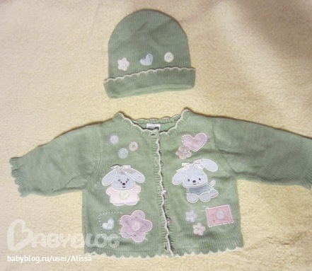 2. Трикотажные кофточка и шапочка. Размер 3-6 мес. нежный возраст еще в принципе :) Вполне мужественного оливкового цвета, но ... В общем, смотрите сами :)