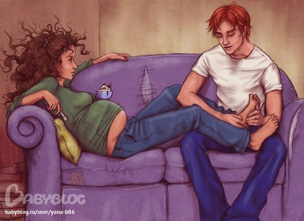 Такую картинку муж прислал в контакт. Прикольная, но какое-то непонятное от нее ощущение. Вроде счастливая семья, ждут ребеночка, жена ест мороженное, заботливый муж делает массаж. А с другой стороны, рваный диван, растрепанная прическа....Странная картинка