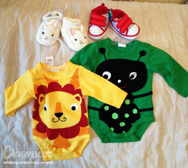 Они разного размера, слип и заяц гдето на 6-9 месяцев, как раз на следующую осень, бодики один маленький остальные 62см, с вещами мы почти закончили, осталось слипиков штучки три купить и все)