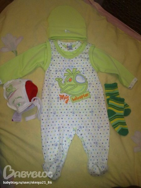 Приданое для малышаЕще несколько недель назад купила несколько шмоточек. Вяжу теплый костюмчик, по этим вещичкам размер примерно смотрю... Пол не знали еще, поэтому купила зелёненькое!))) То, что подойдет и мальчику и девочке))))